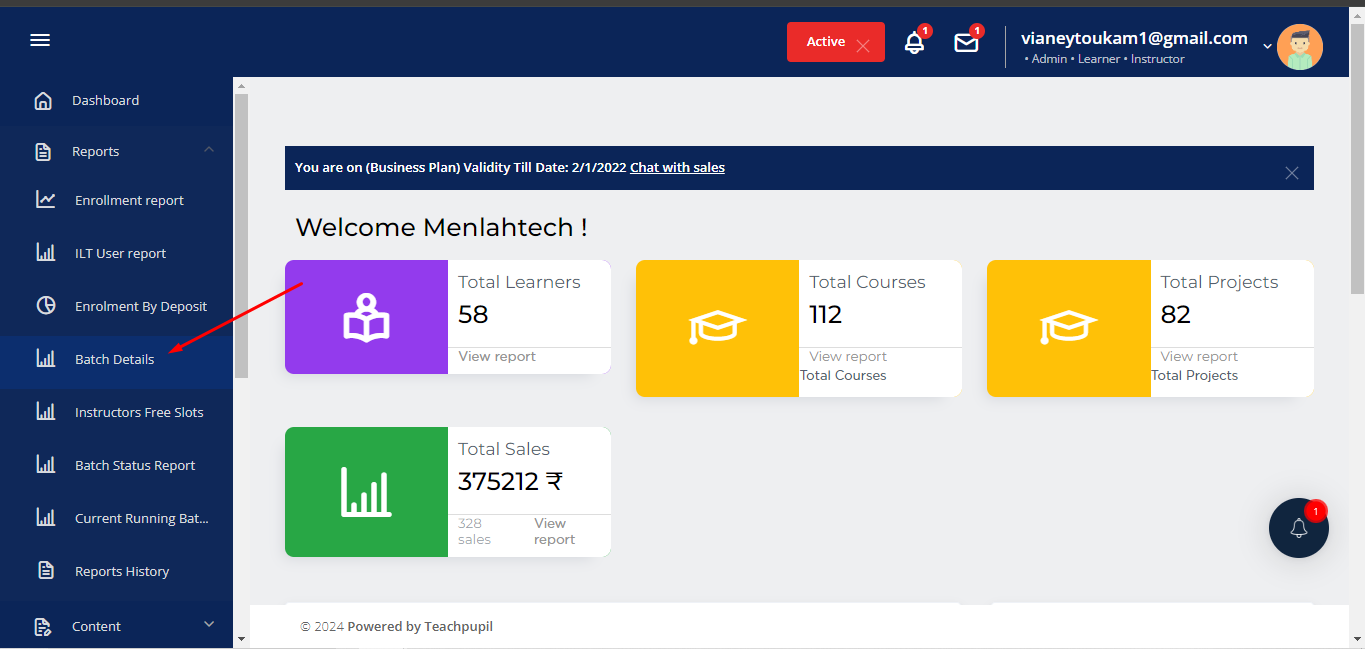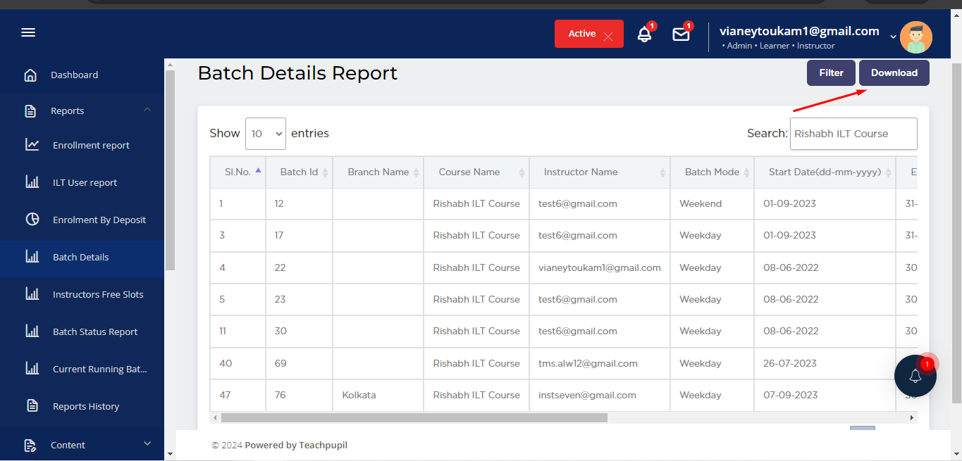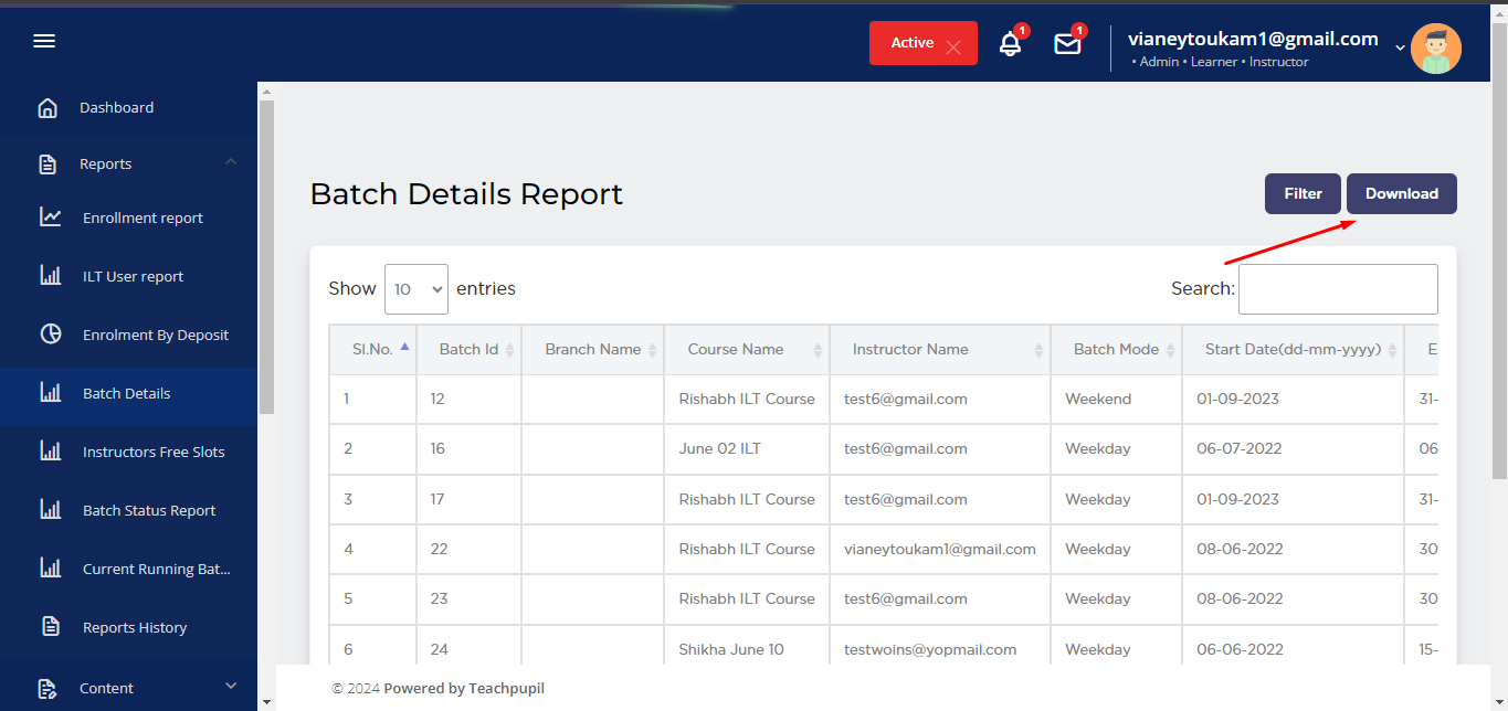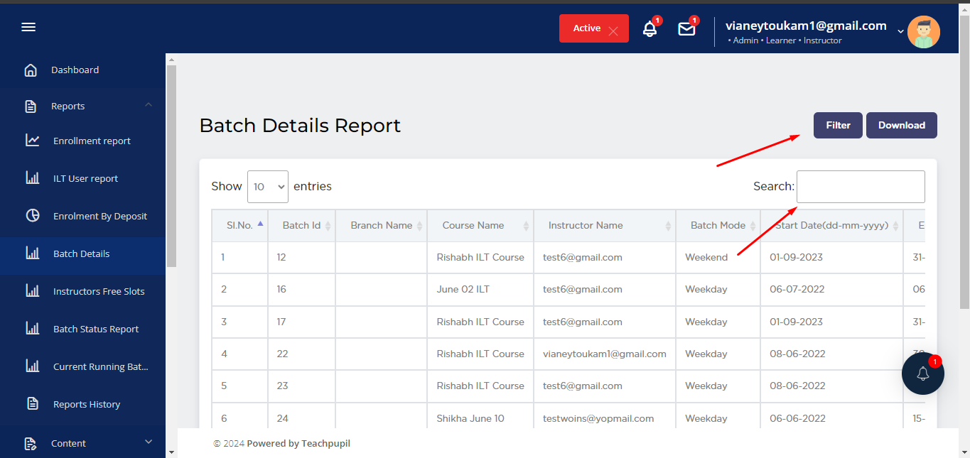 How to view batch details reports - 1. Log in as instructor and expand reports section - 2. Click on Batch details report - 3. Batch details report will open and here you can view all the batches details of your institute. 4. To view more details of ...