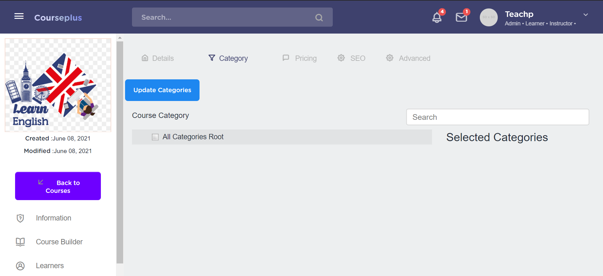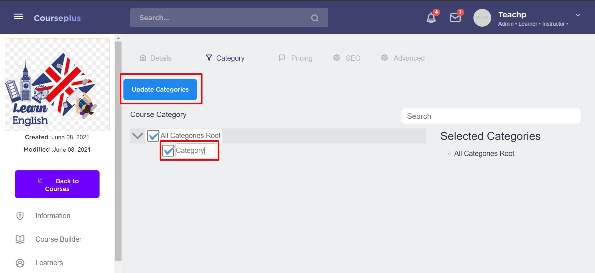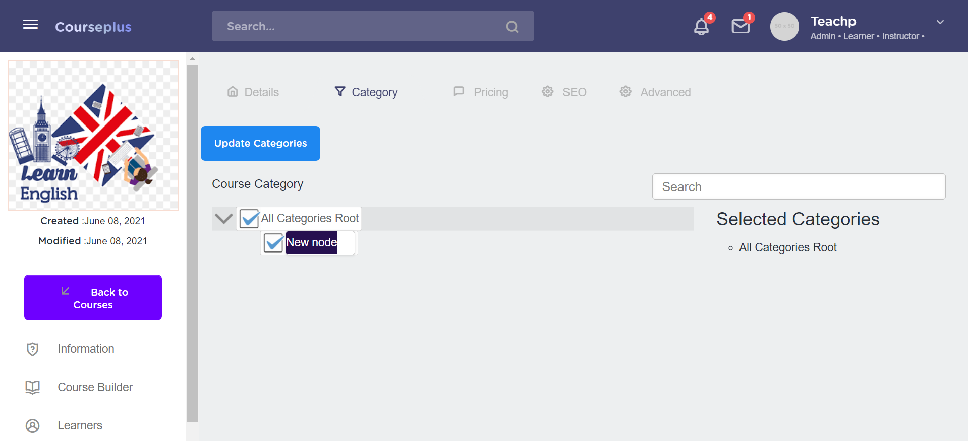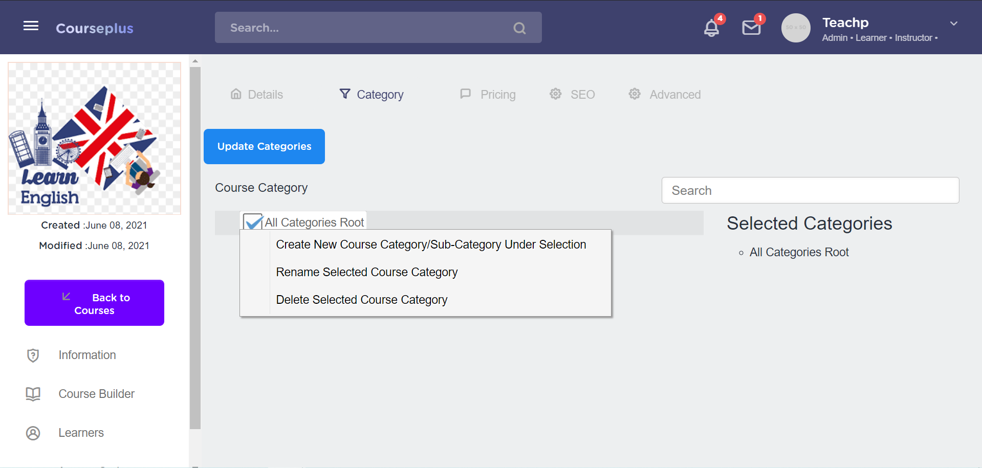 Right click on the “All Categories Root” option, three options will be displayed - “Create New Course Category/Sub-Category Under Selection” , “Rename Selected Course Category” and “Deleted Selected Course Category”.