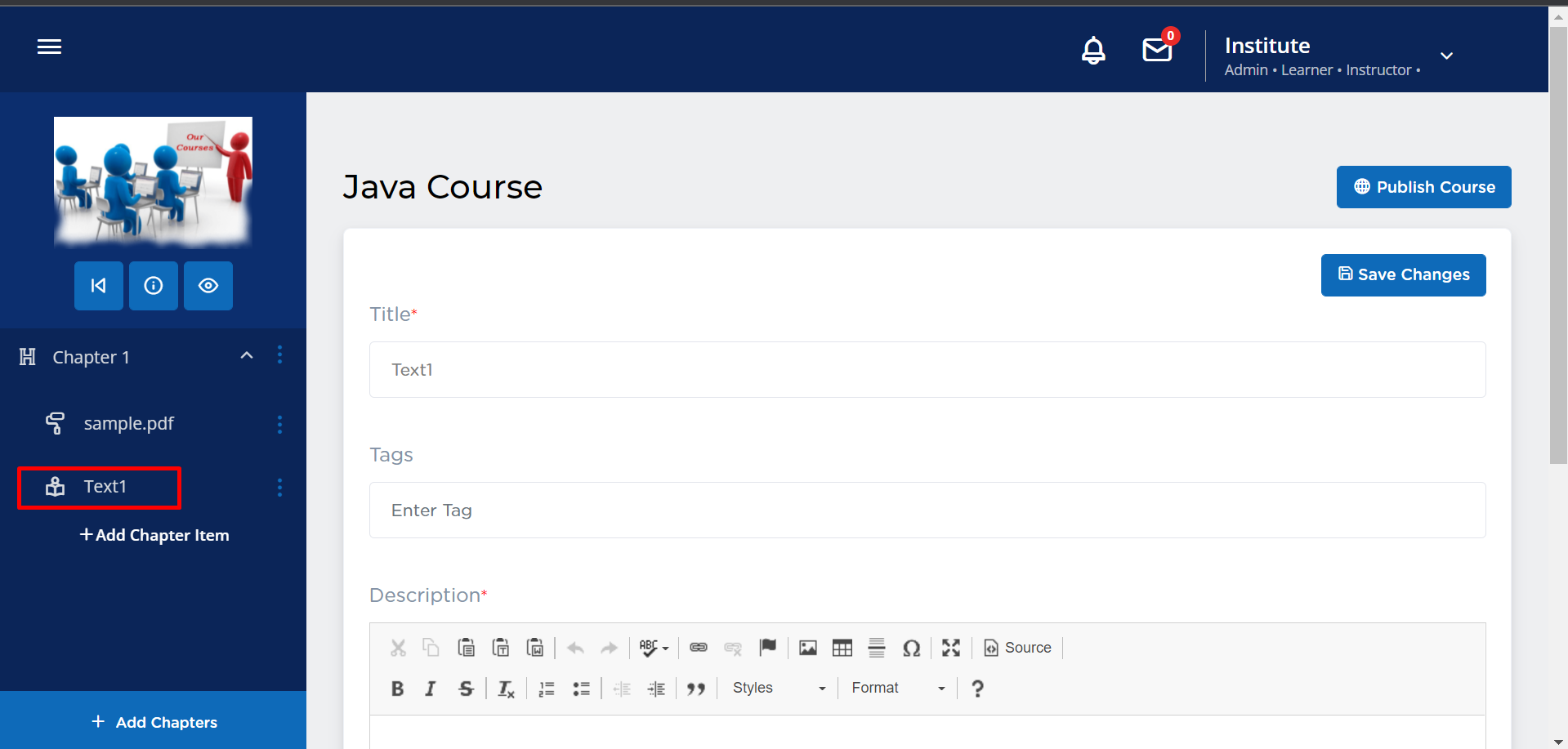 An HTML editor will open, where you can enter the whole textual lesson along with its title. This feature allows multiple types of texts including special characters, images, video files etc.