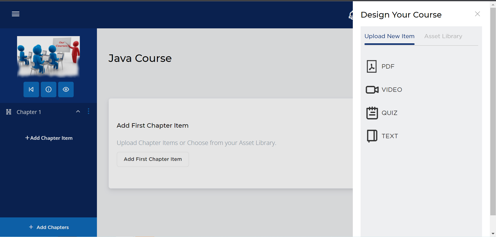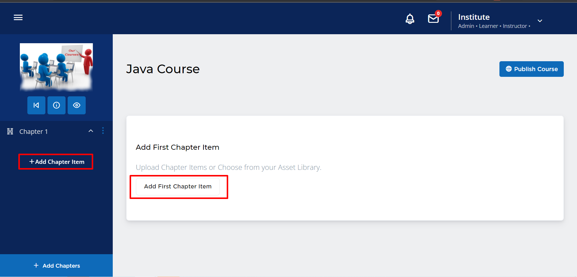 In the Course Builder landing page, click on “Add First Chapter Items” or “Add Chapter Item”.