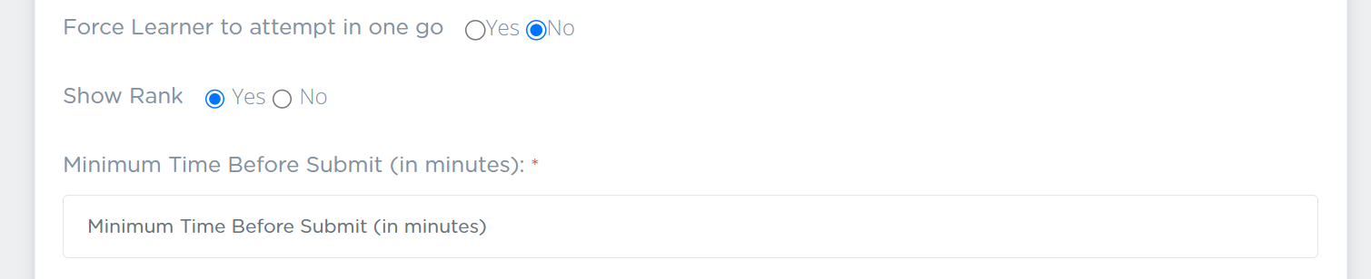 Minimum Time Before Submit (in min): You can allow a minimum time taken by the learners to attempt a Quiz. The learners won't be able to submit the Quiz before completing the minimum allotted time.