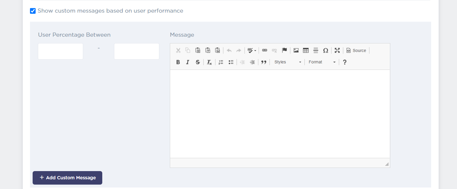 Show custom message based on user performance: You can use this option to set customized remarks for learners based on their scores.