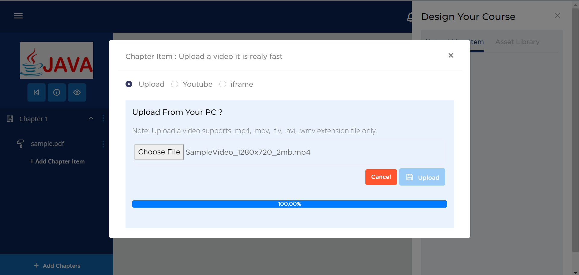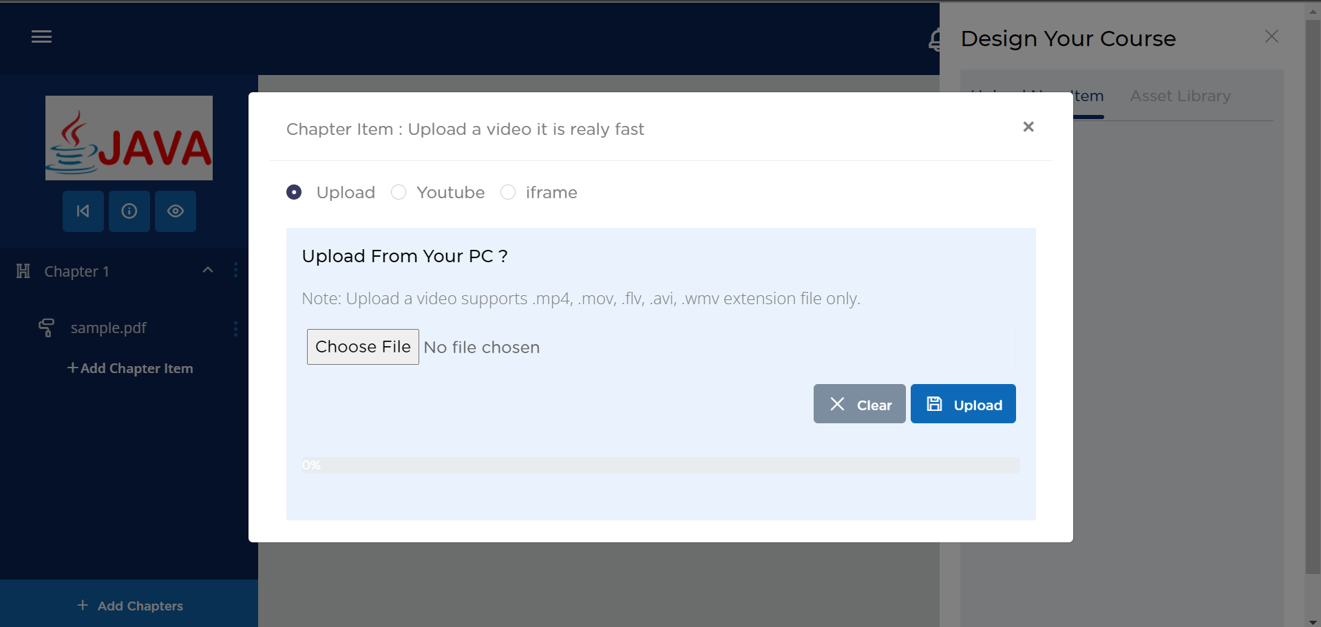 In the Course Builder landing page, click on “Add First Chapter Items” or “Add Chapter Item”. A set of options would pop-up in "Design Your Course" section to select your preferred form of uploading content. Upload New Item This option allows you to ...