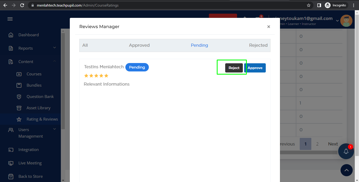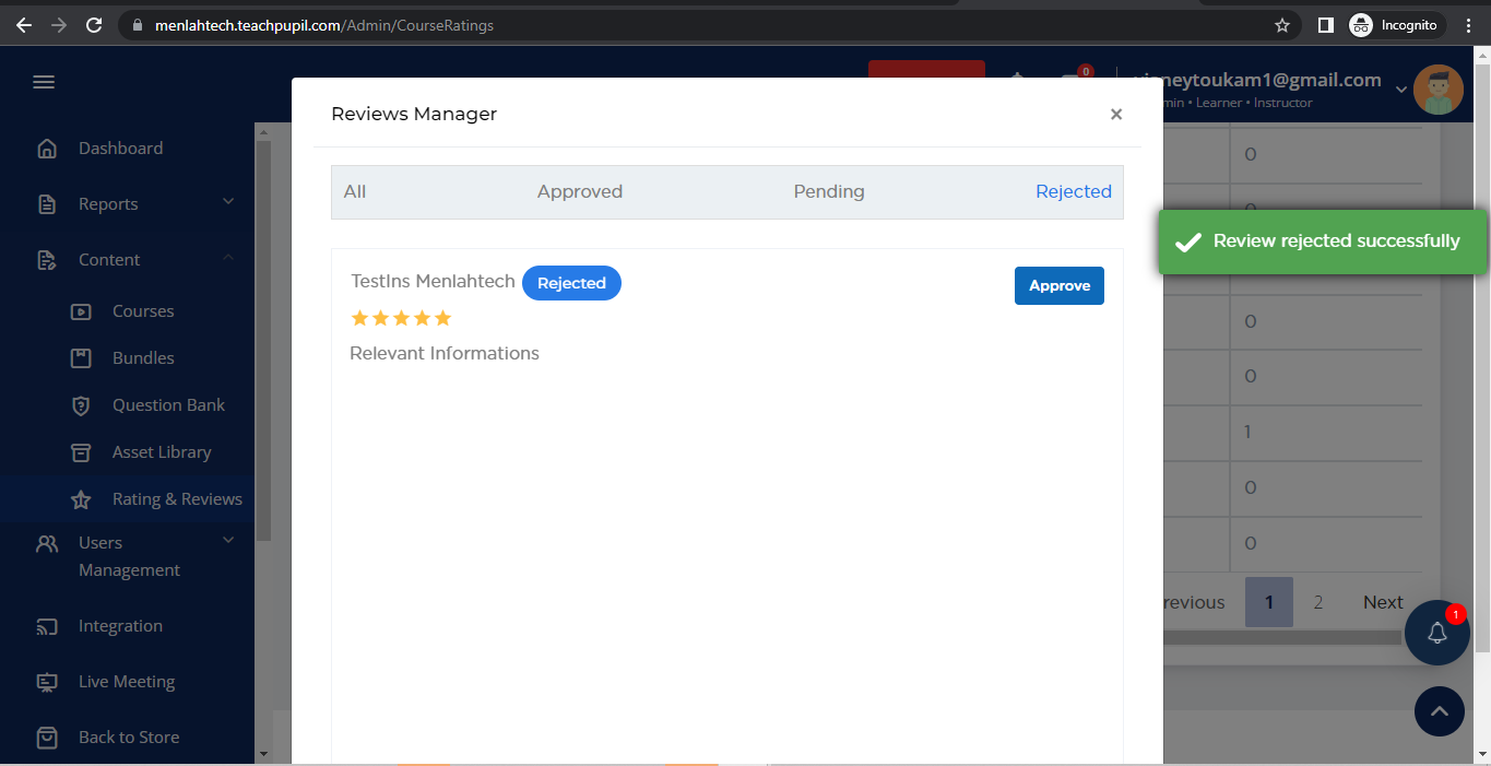 Once the Review is Rejected Succesfully it won't be visible in the course review section.
