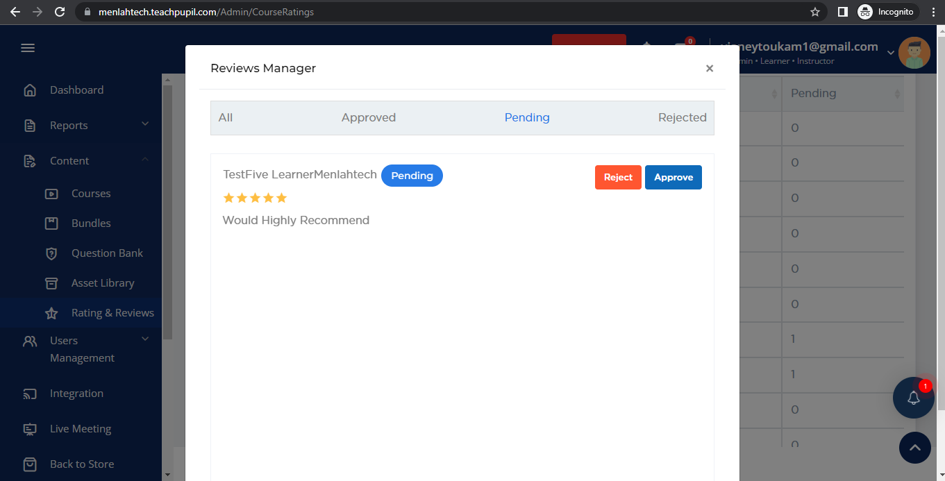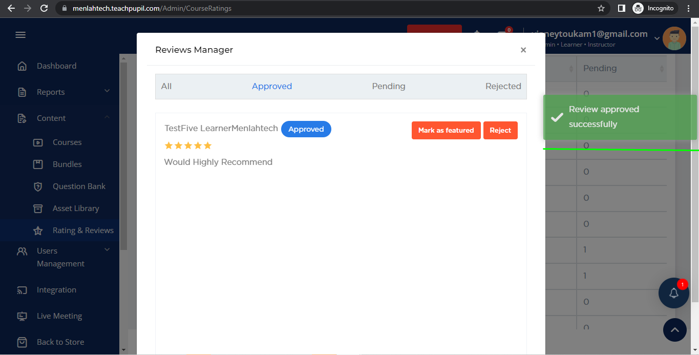 You can now select weather you want to approve or reject the review, if you approve you'll get a validation message "Review Approved Successfully".