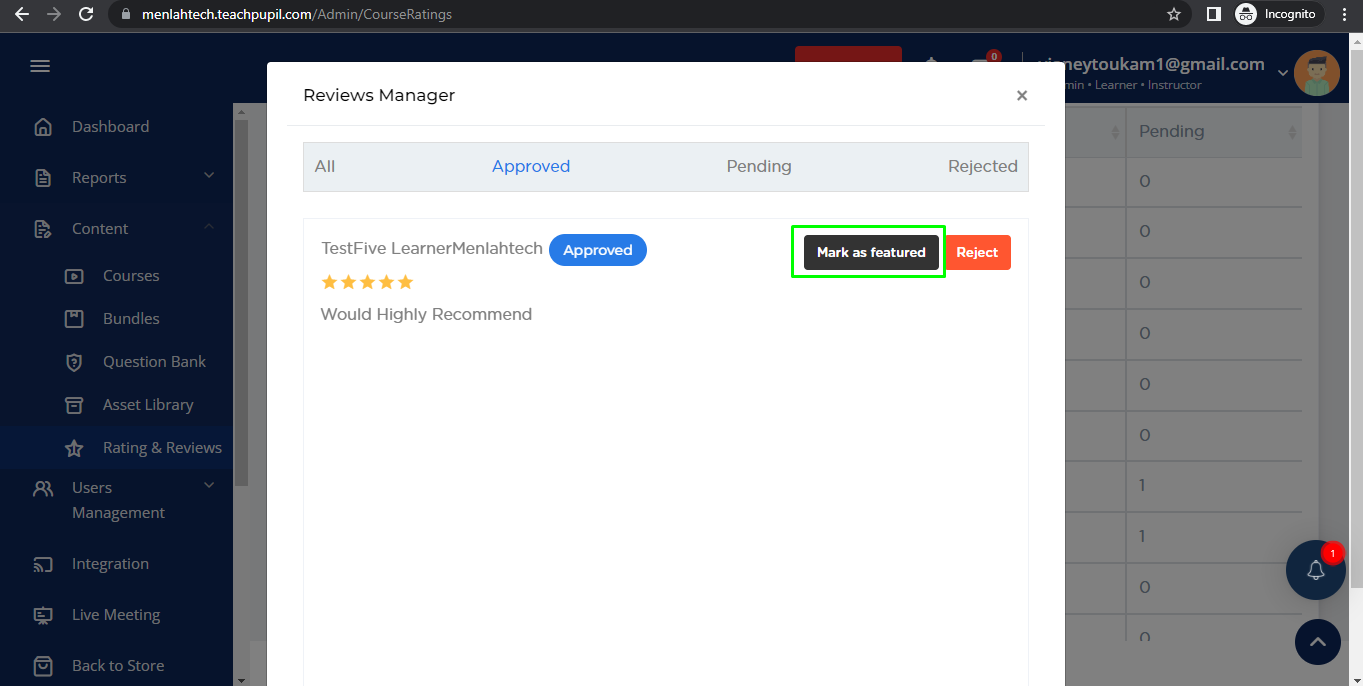 Once the review is marked as Approved, it gets shifted to the Approved section, were the review can also be Marked as Featured/Reject.