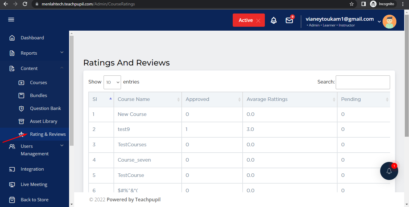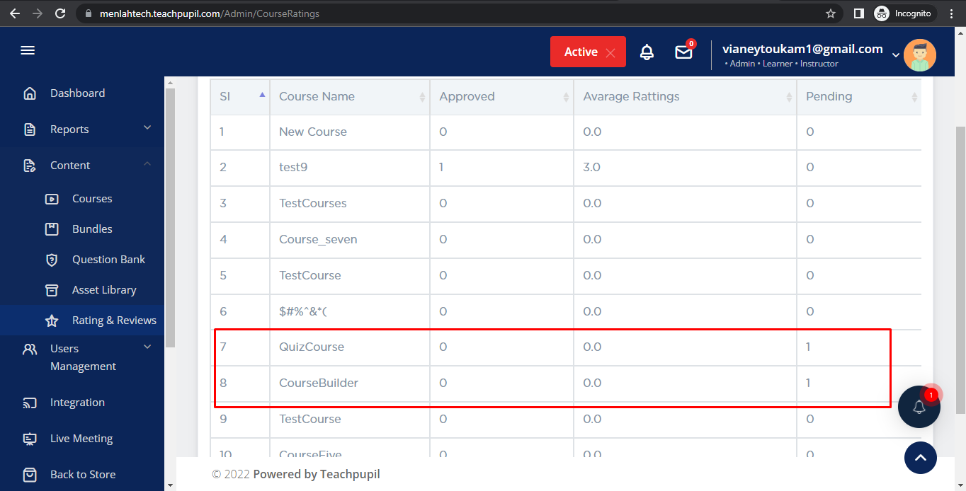 Go to your Dashboard->Contents->Ratings&Reviews section, you'll see the list of courses with there status.