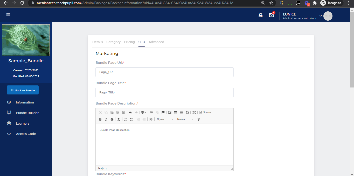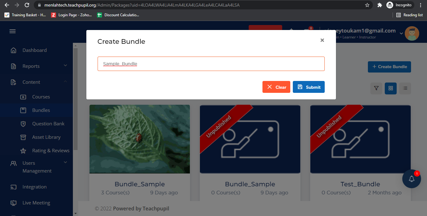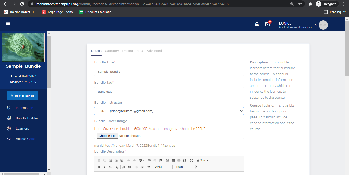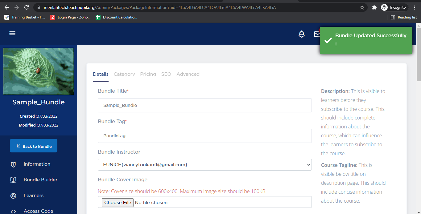 Fill in the required details such as - Bundle name, Bundle tag, Bundle description, Bundle image (Cover size should be 600x400. Maximum image size should be 100KB.)