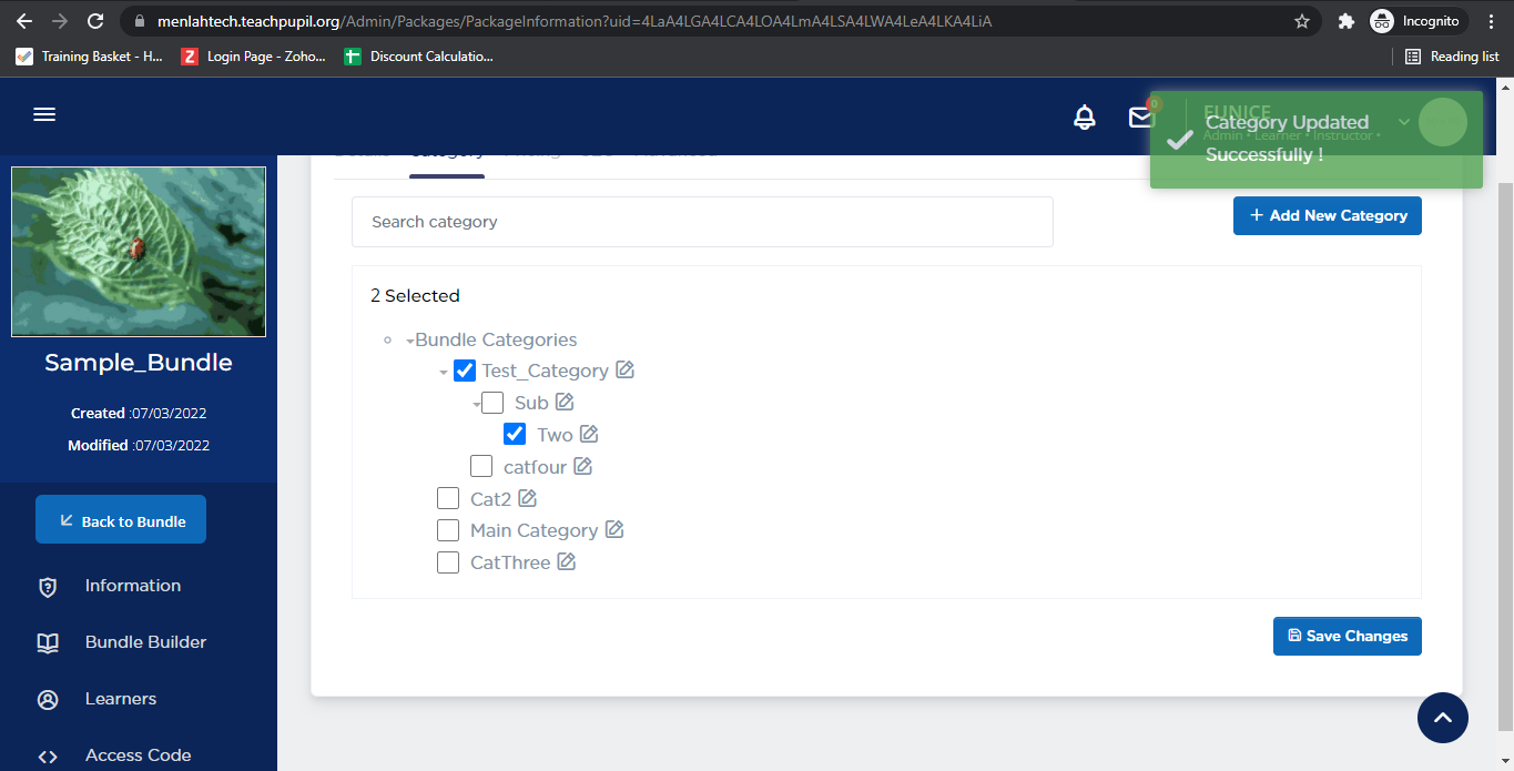 After selecting the category click on the "Save Changes" button and a validation message of "Category Updated Successfully".