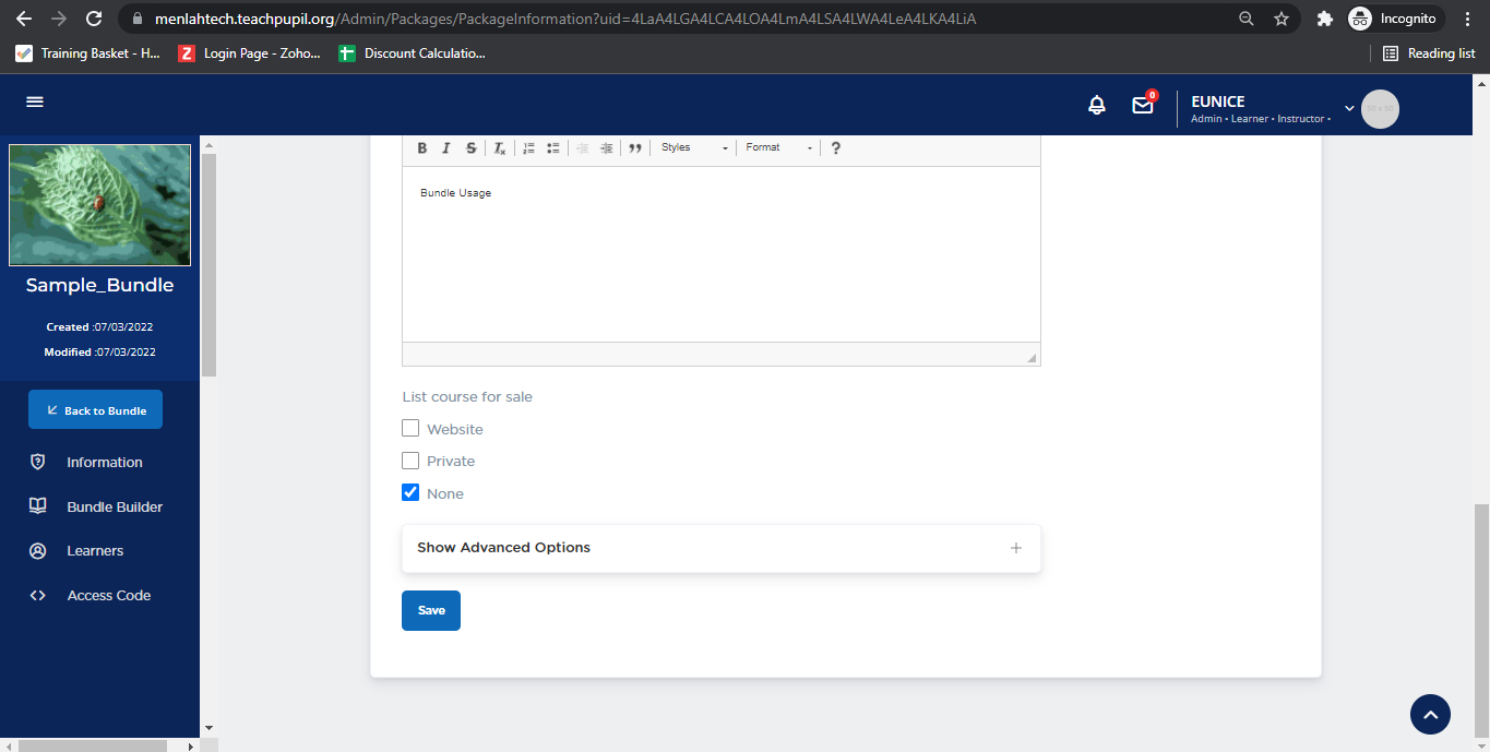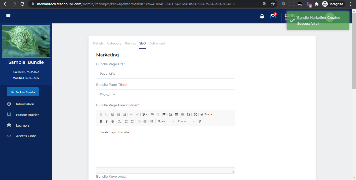 Fill the required information correctly and click on the save option. And a validation message of "Bundle Updated Successfully".