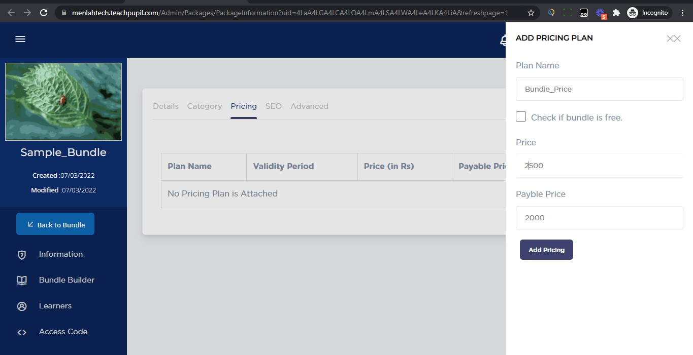 Now add the pricing plan for your bundle, Plan name, Price and Payable price.