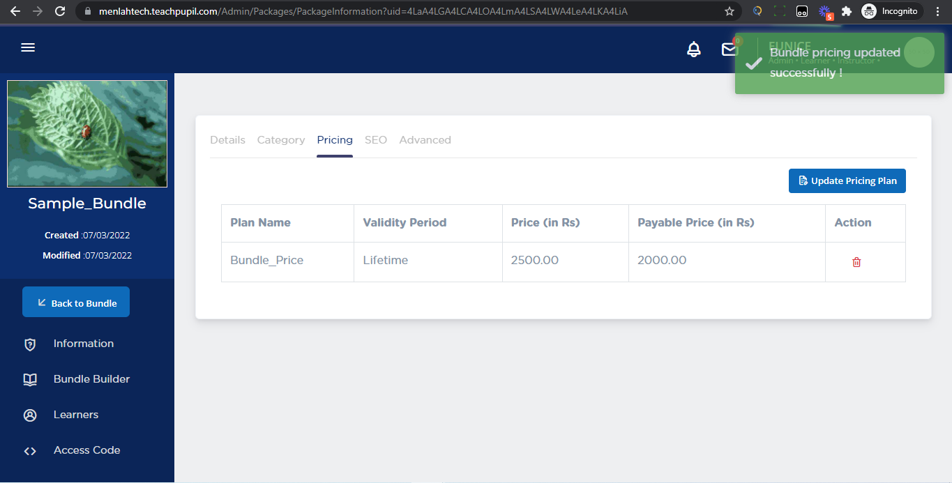 G Click on the Add Pricing button after filling the valid details, and a validation message of "Bundle pricing updated successfully".