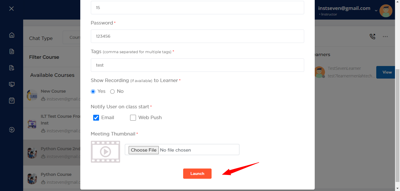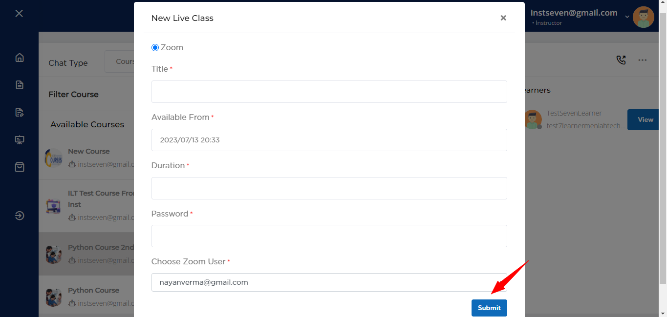 3. Now, new live class pop up will appear. After filling all the details click on submit.