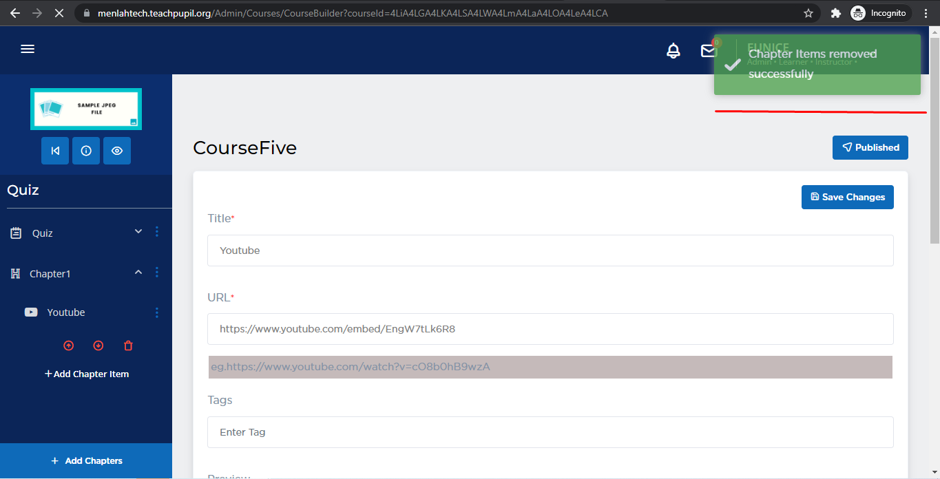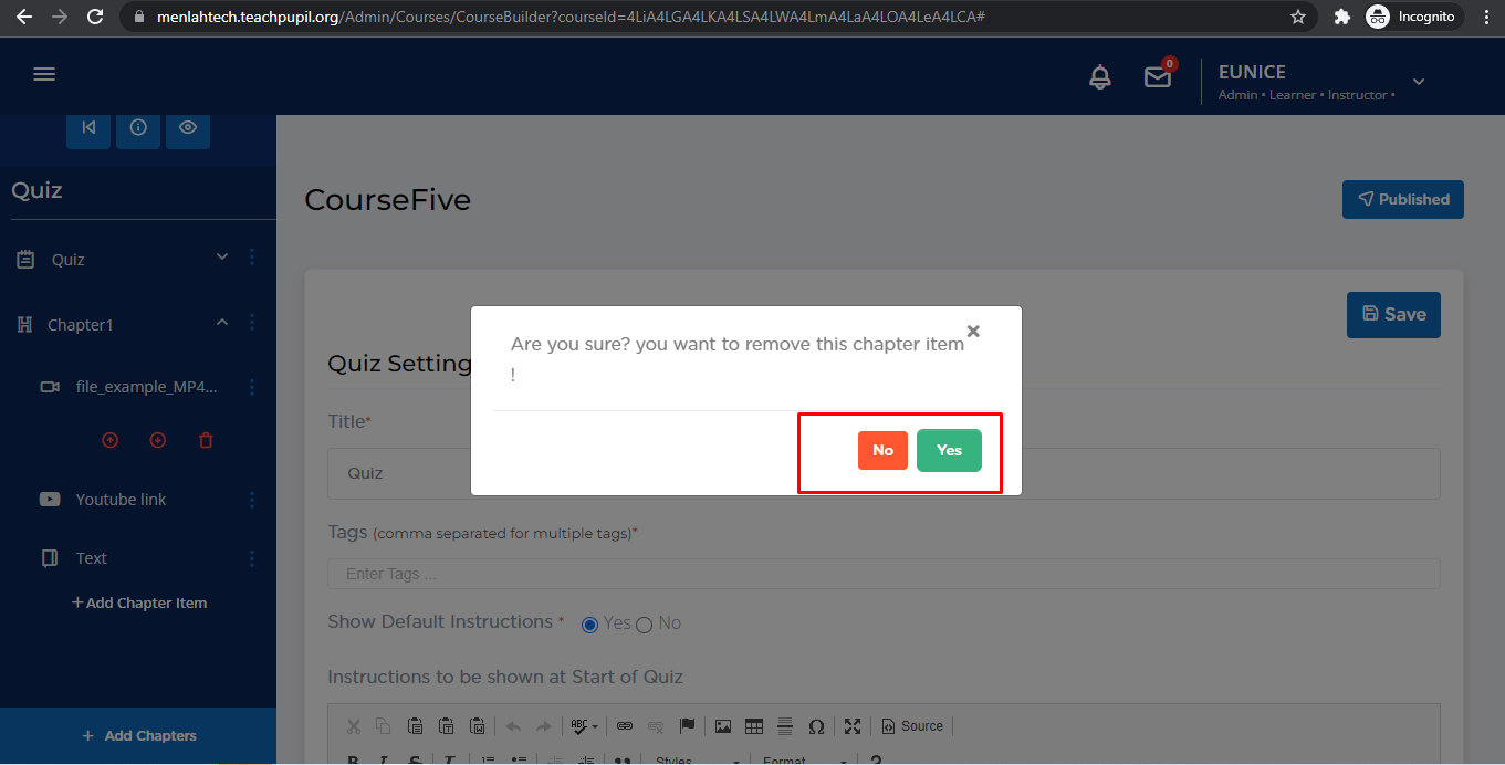 Select the delete icon and confirm if you want to delete that particular chapter item.