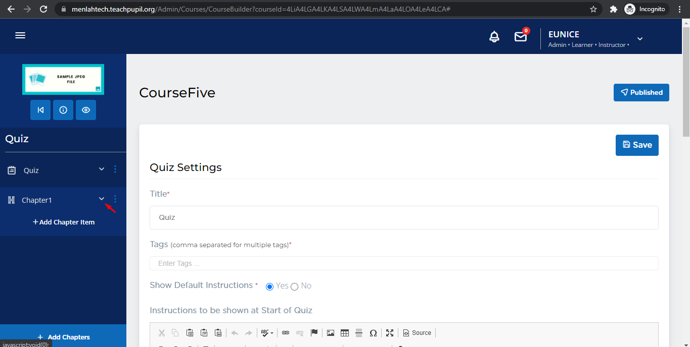 In the Course Builder landing page, click on the “Drop Down” icon to see the chapter items.