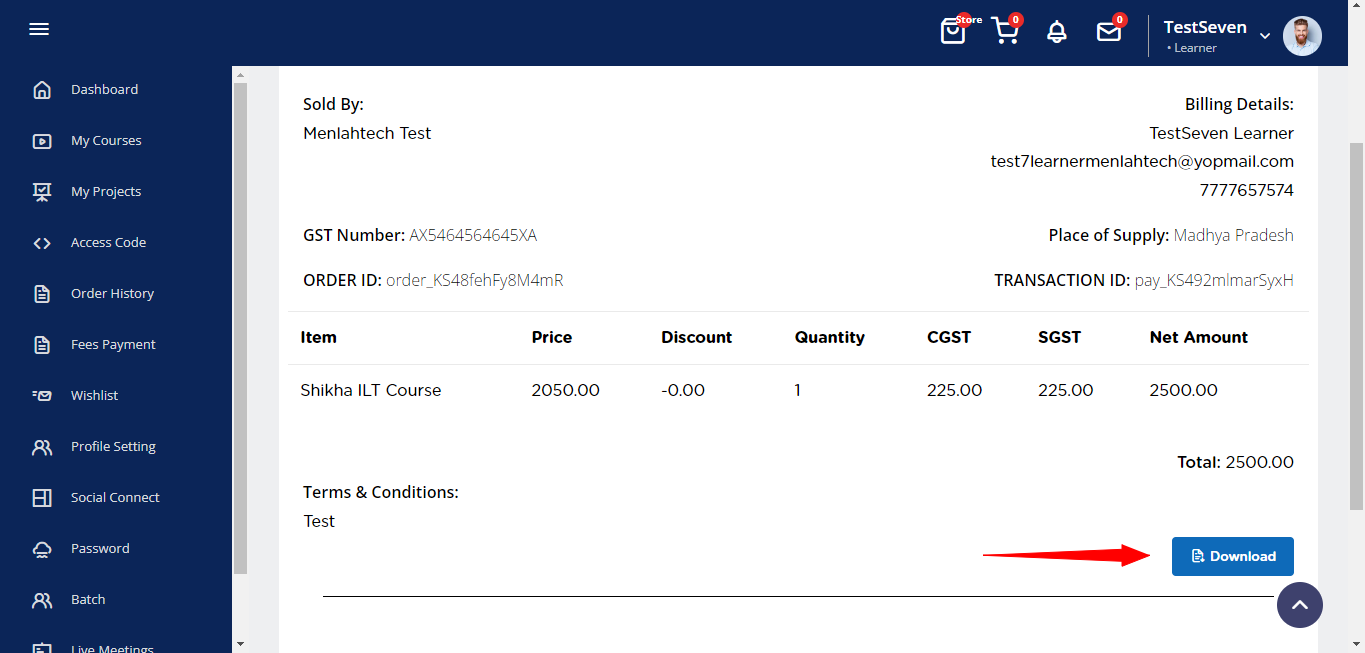 3. Now on order details page will appear, click on download button to download the order receipt and pdf file will be downloaded.