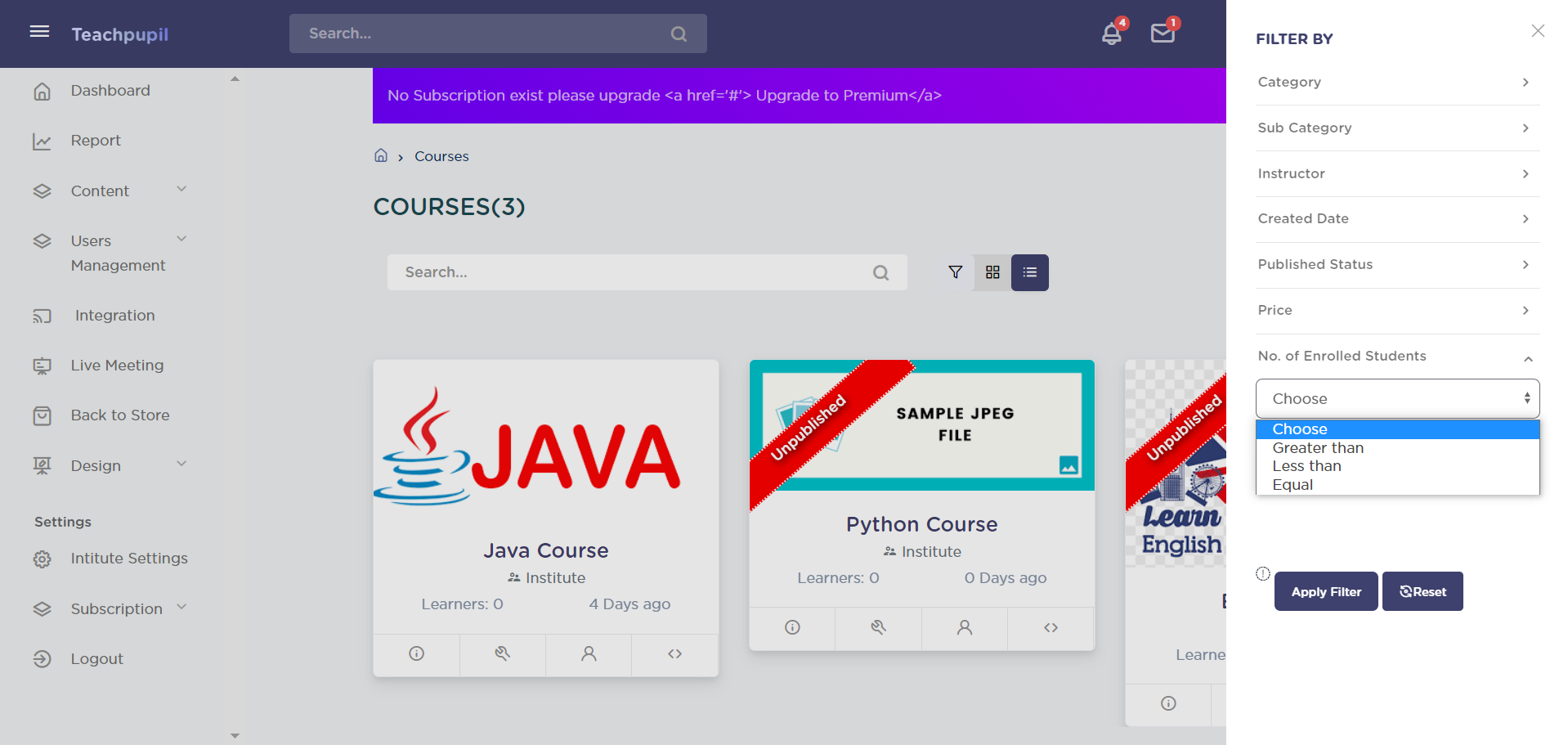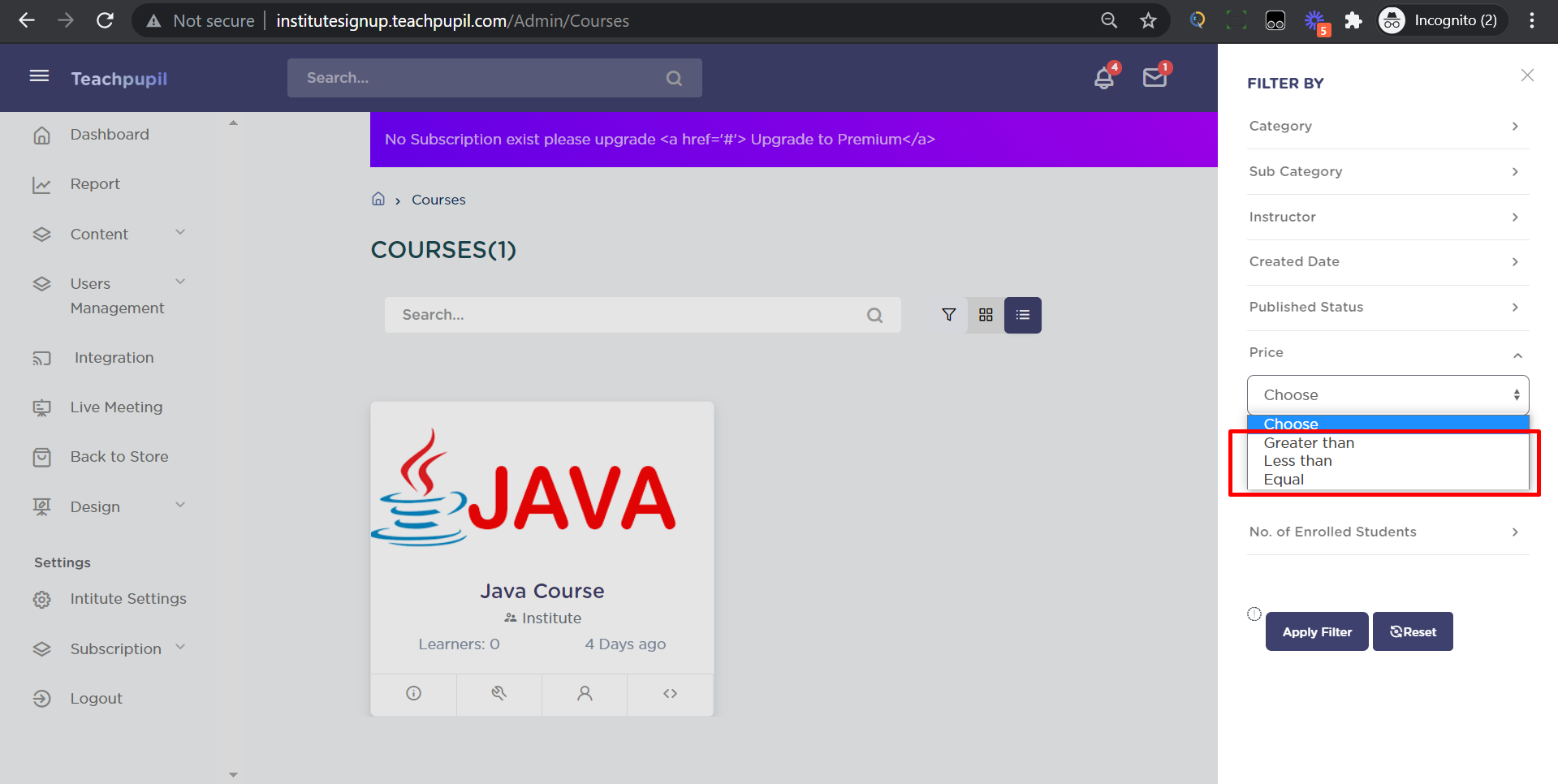 The course displayed will be according to the price option selected. In price there are three options- Greater than, Less than and Equal