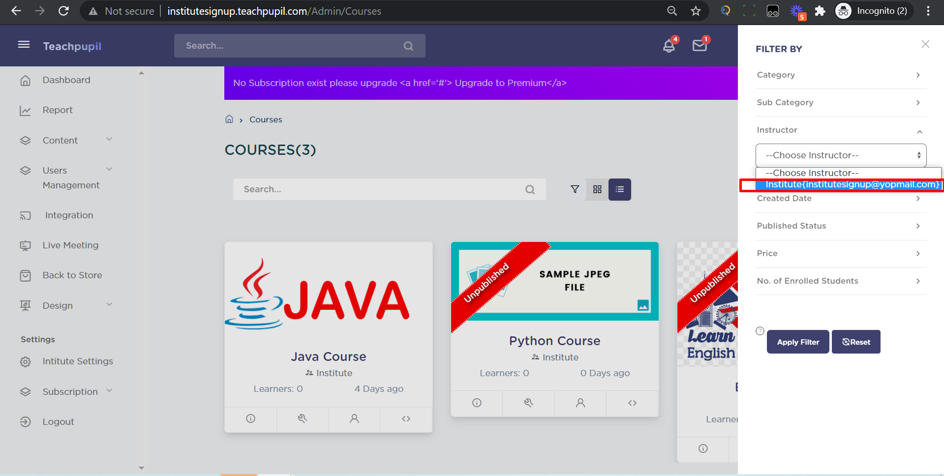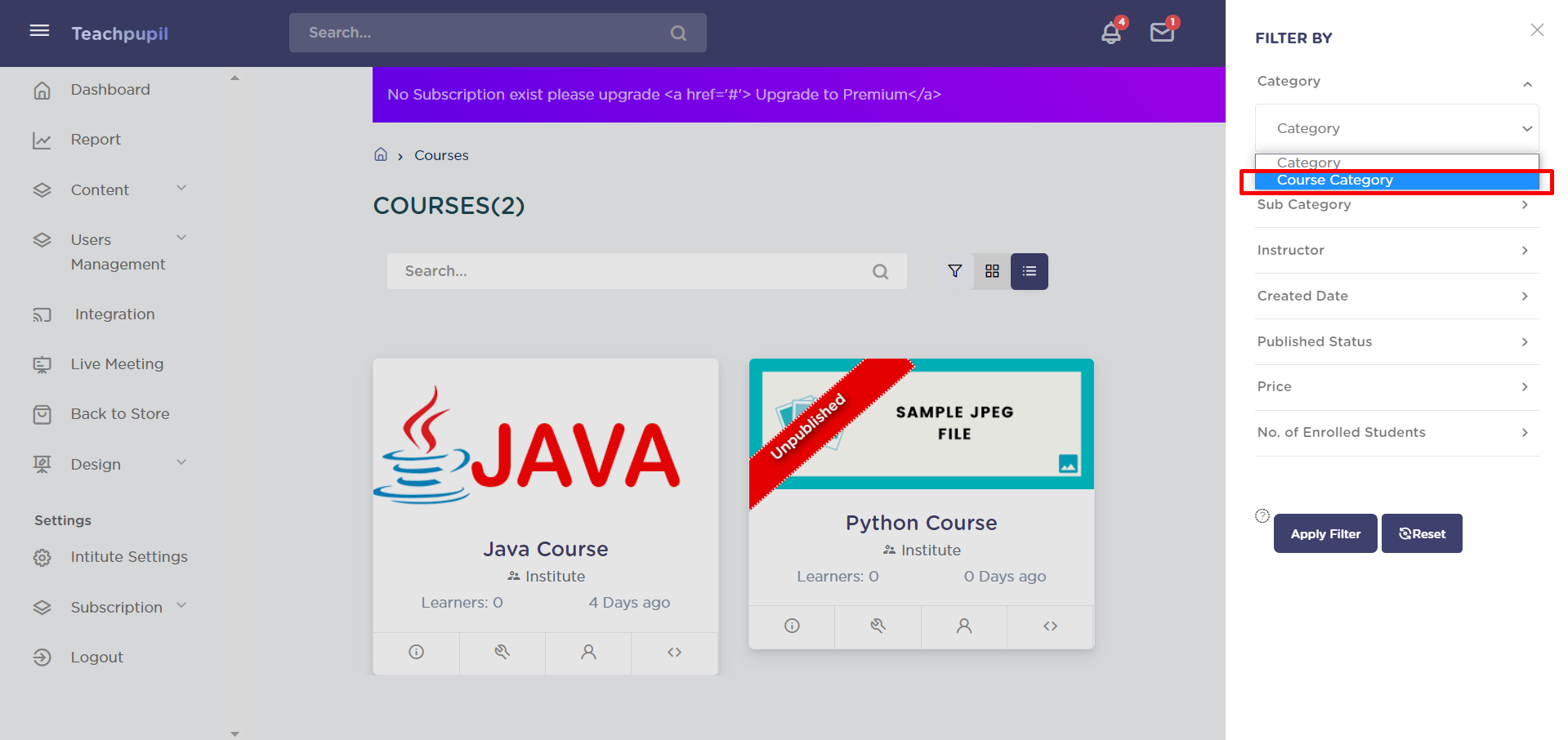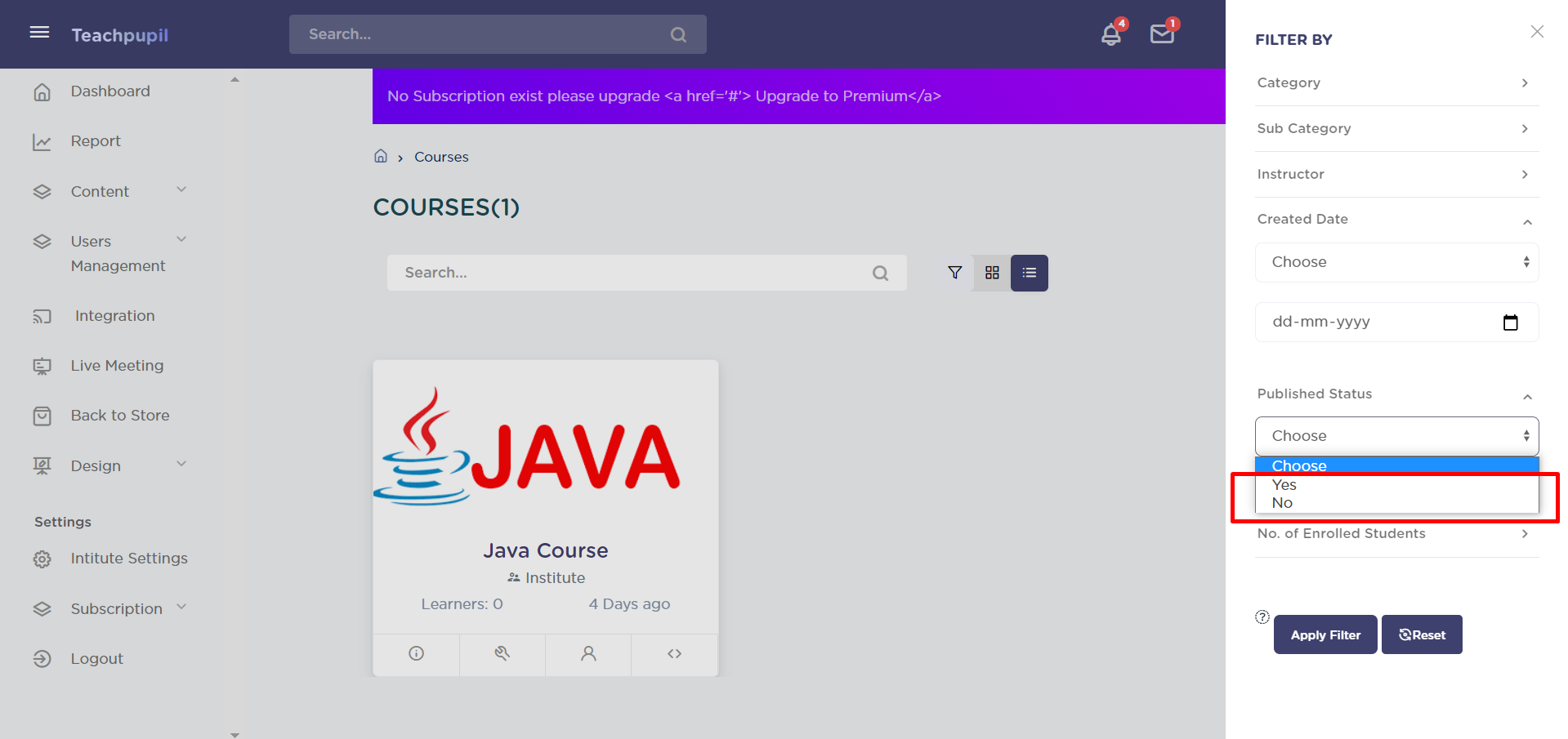 The course filter applied will be according to the published status selected - “Yes” or “No”.