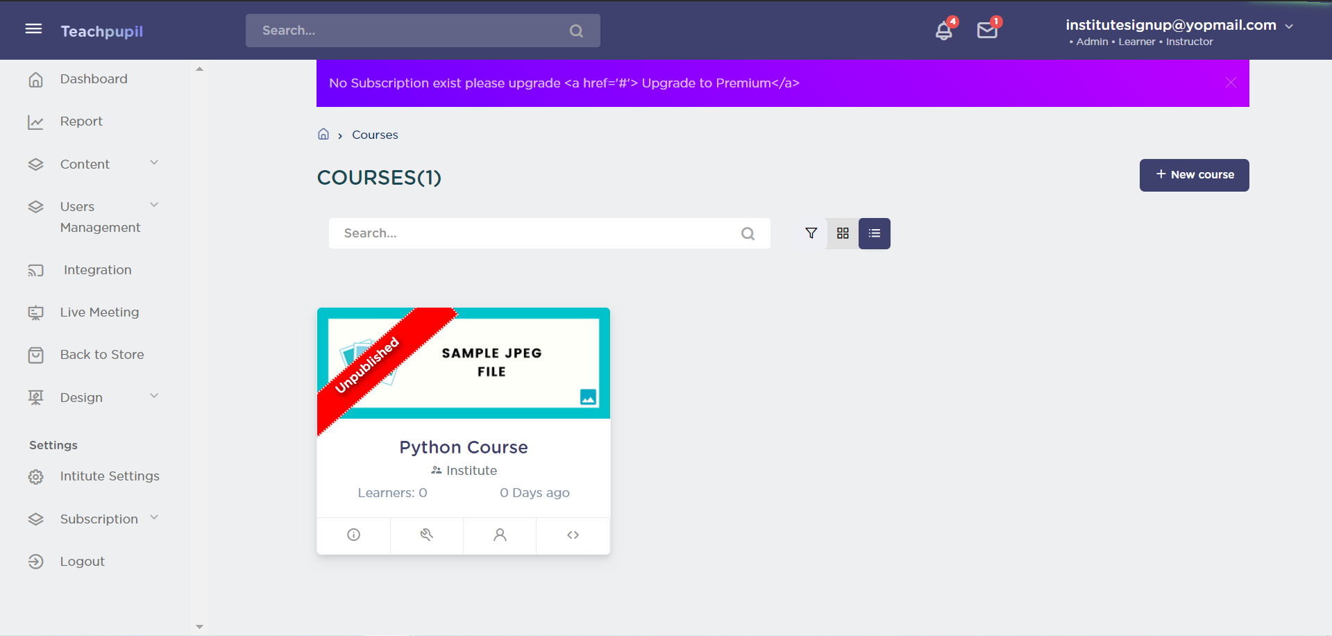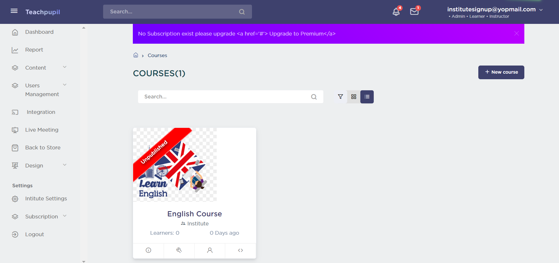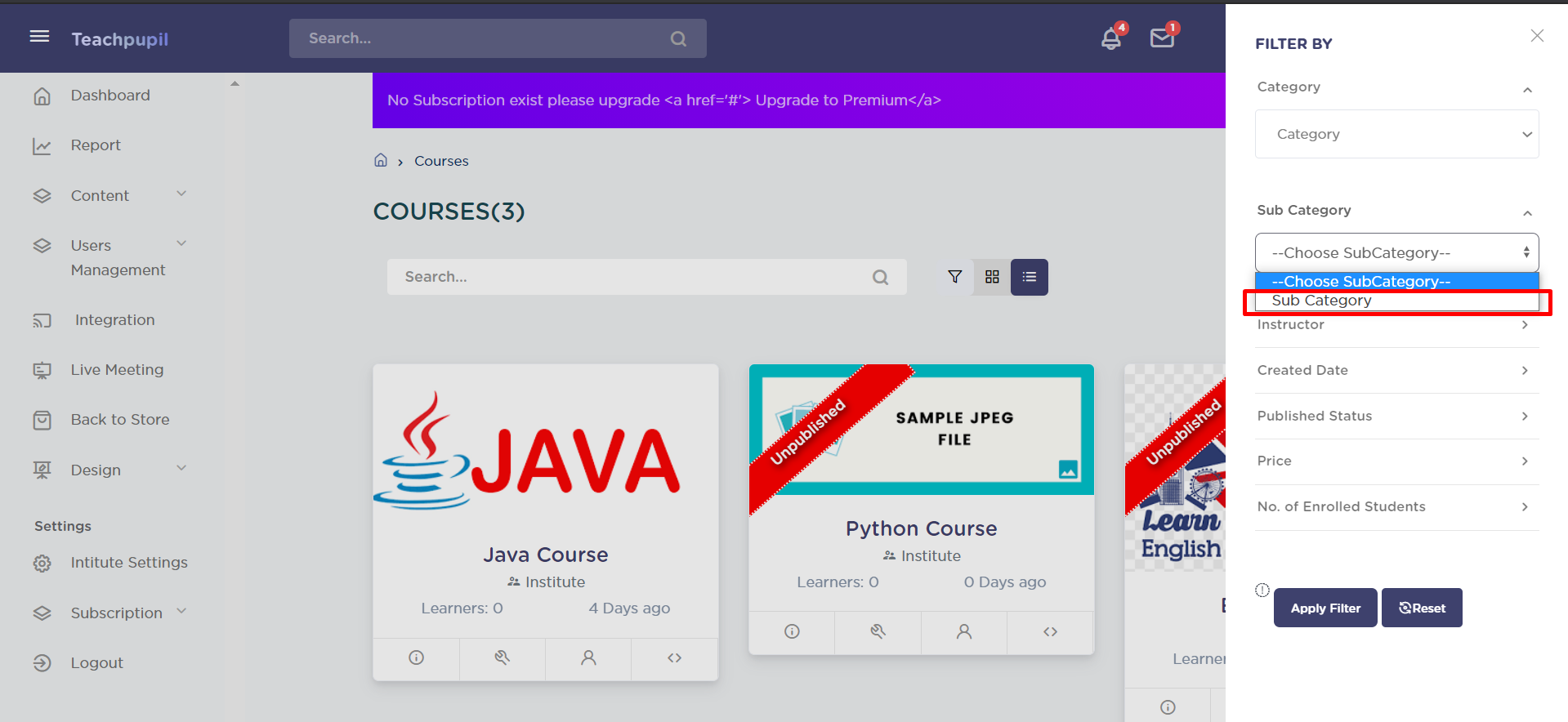 The course filter applied will be according to the published status selected - “Yes” or “No”.