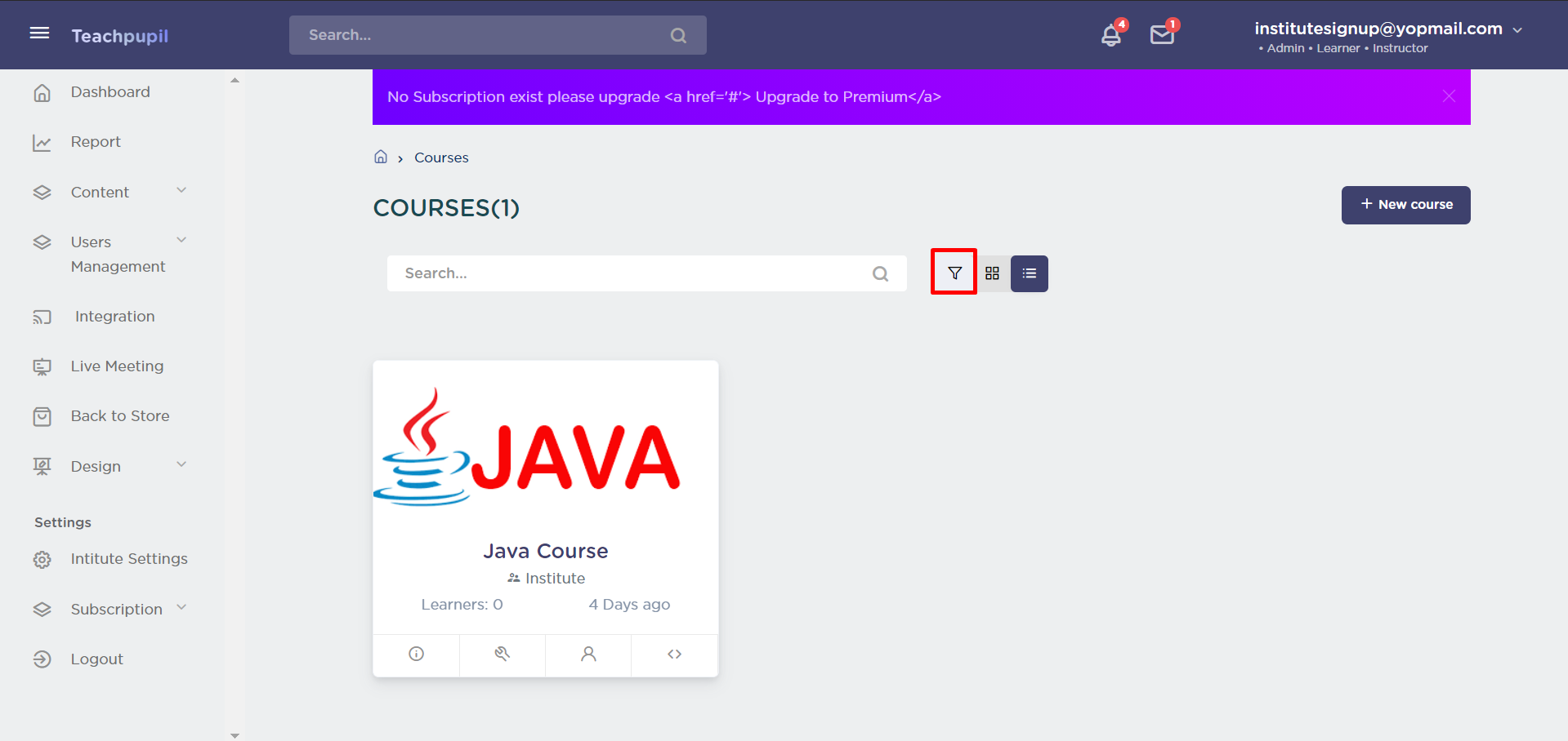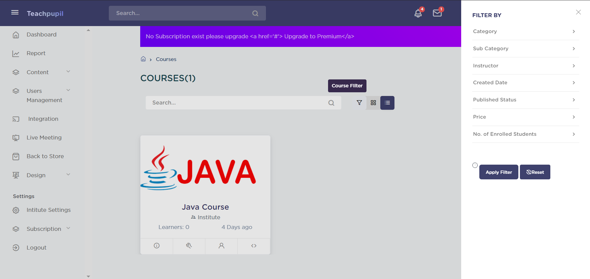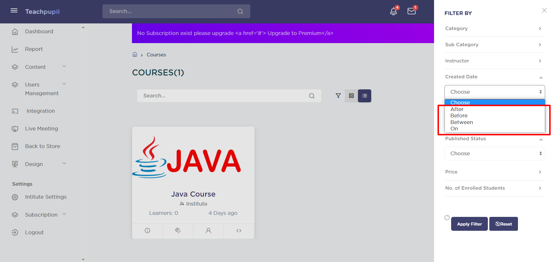 The course filter applied will be according to the created date selected. It has four options - After, Before, Between and On.