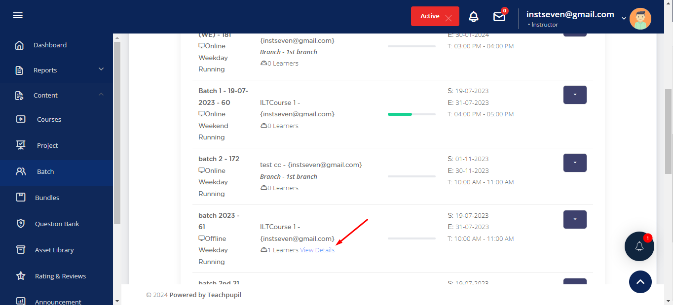 a. Click on batch page and then click "View details" option to view learners details in the particular batch.