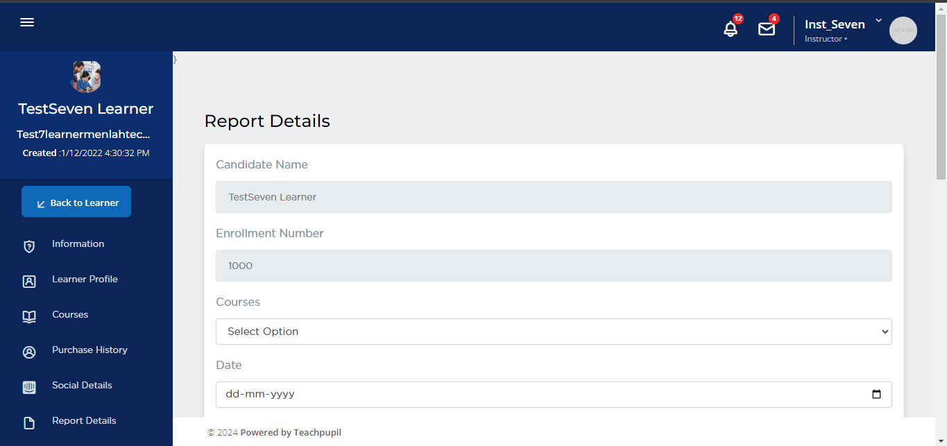 To provide report to learners from Admin or Instructor, learner should be enrolled in at least one course.