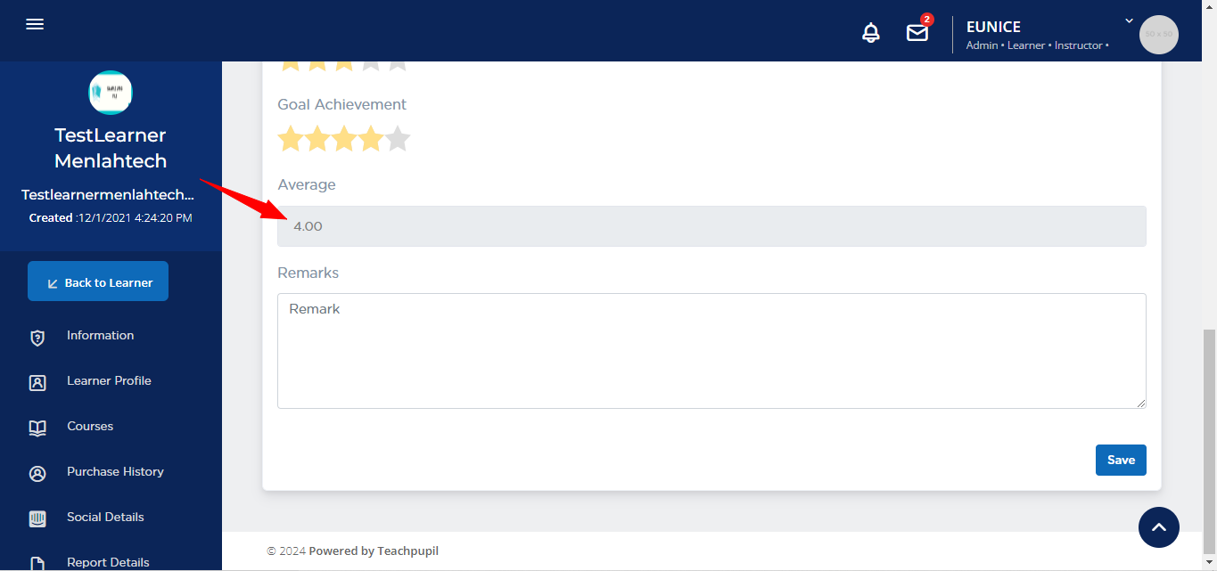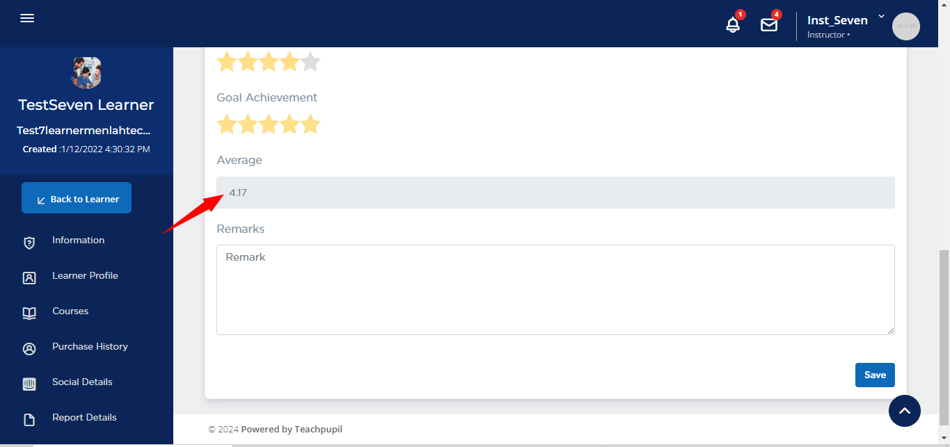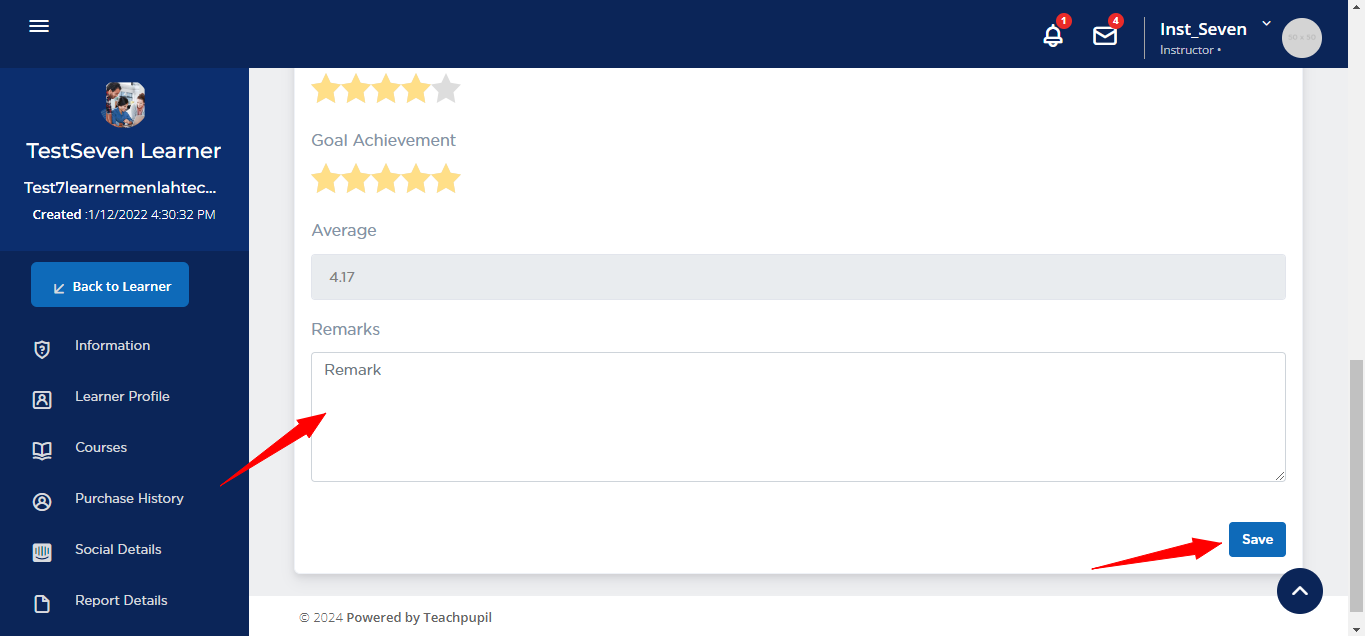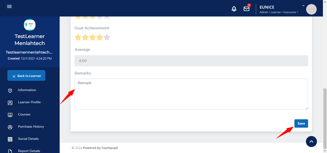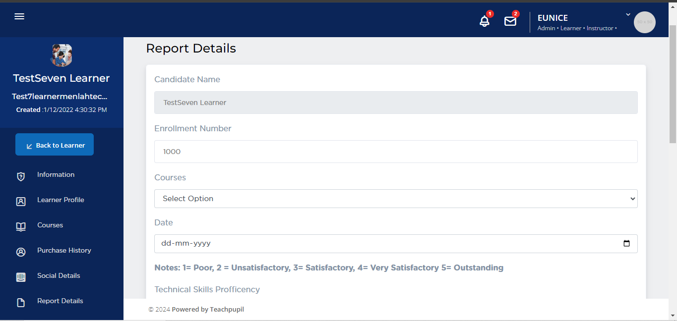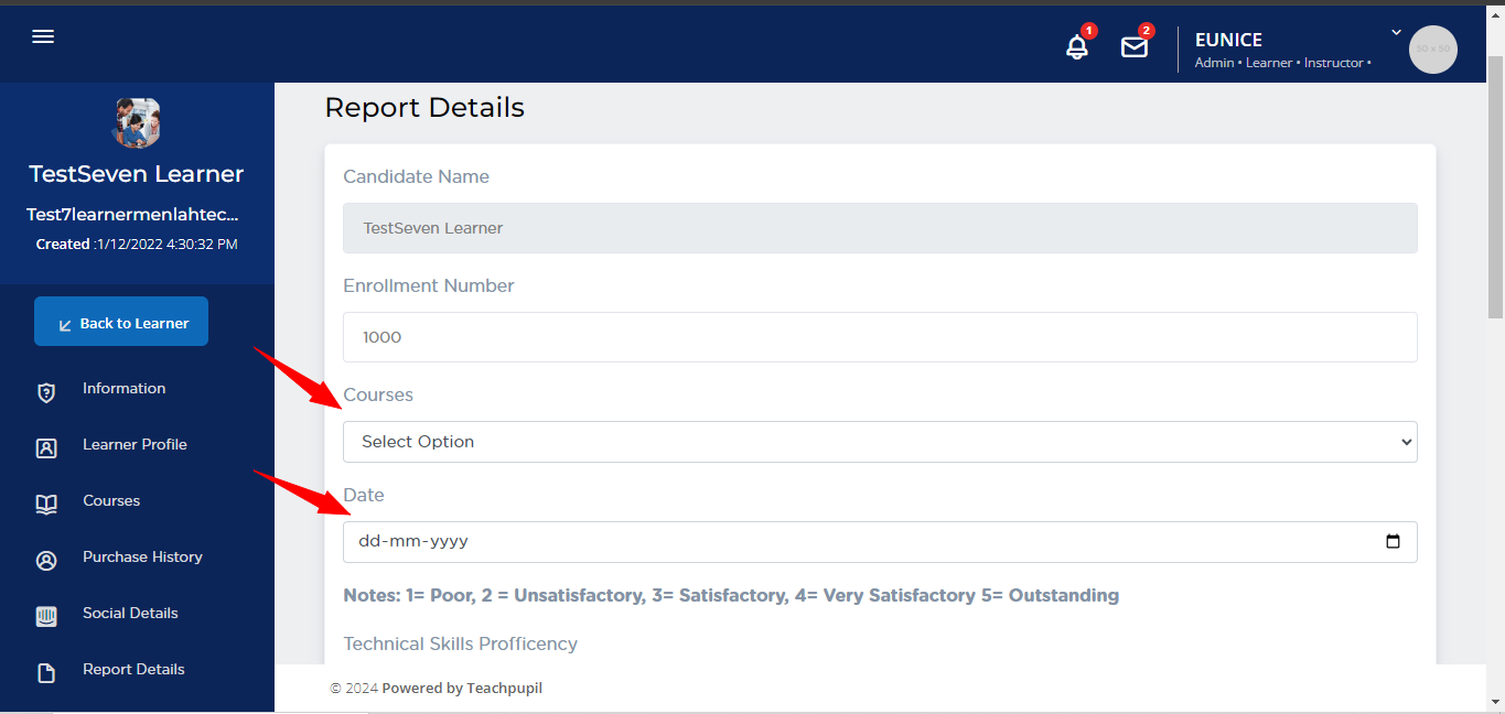 e. Select date and course in which learner is enrolled. Then, provide stars rating for the available skills.