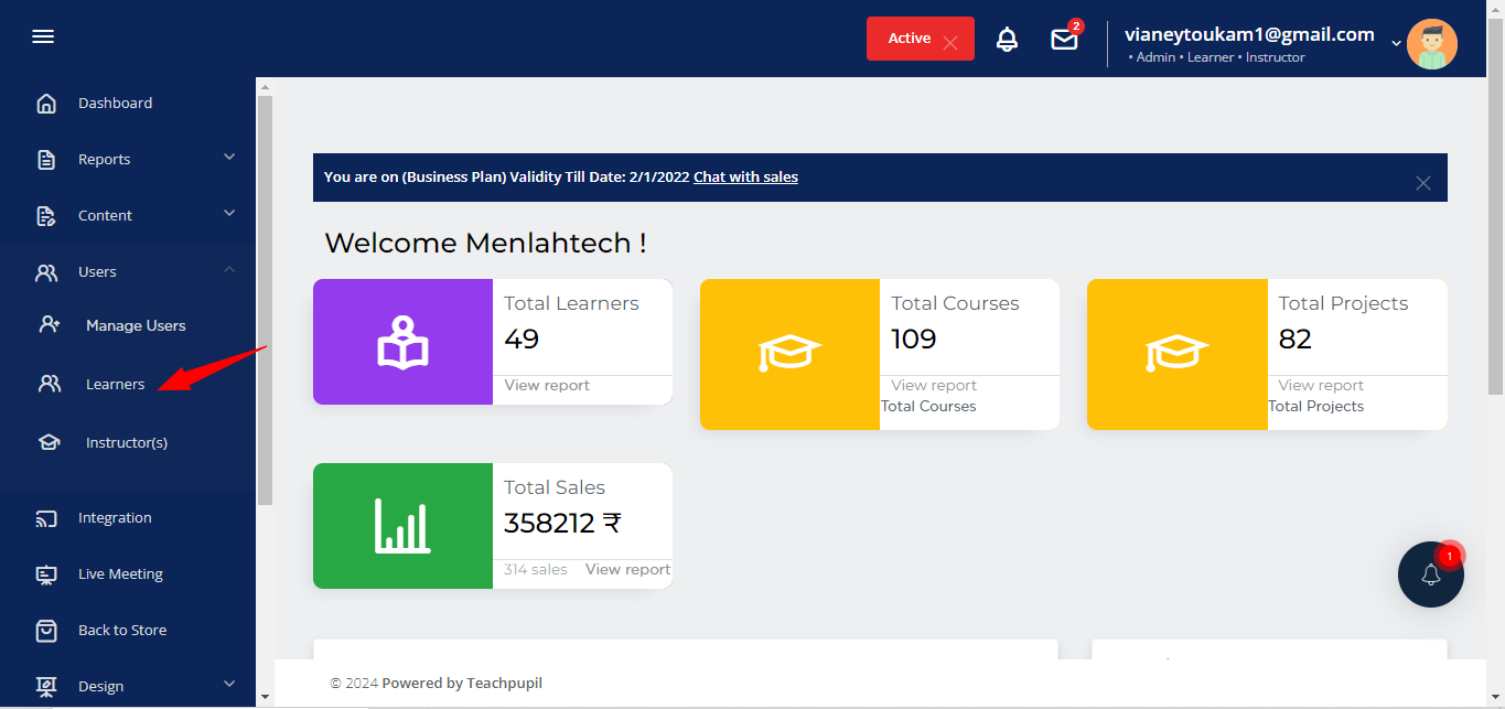 2. Log in as Admin: Admins can access report page from three ways: i) Batch page and ii) Courses page iii) Learners page under Users section.