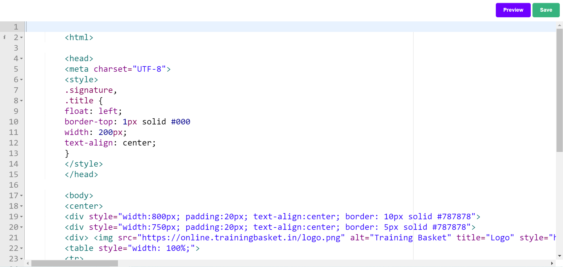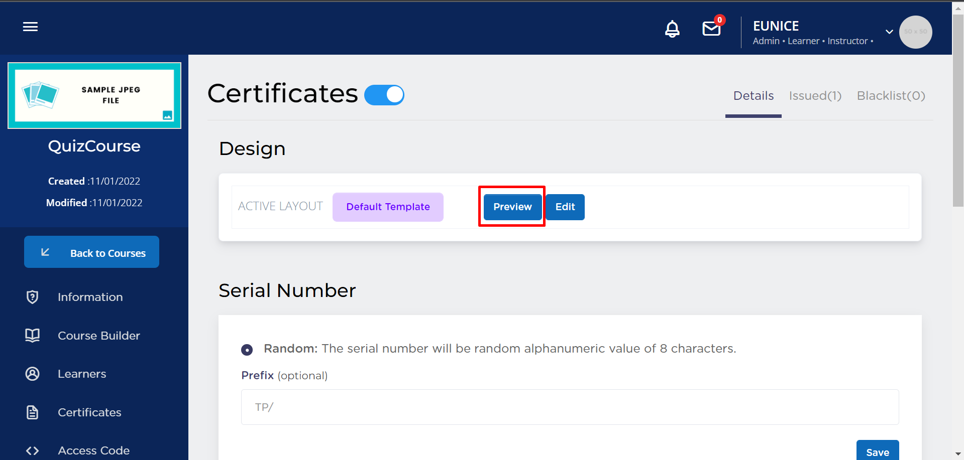 A pre-designed certificate is provided in the platform. Click on "Preview" to preview the certificate. A new tab will open where the certificate will be previewed.