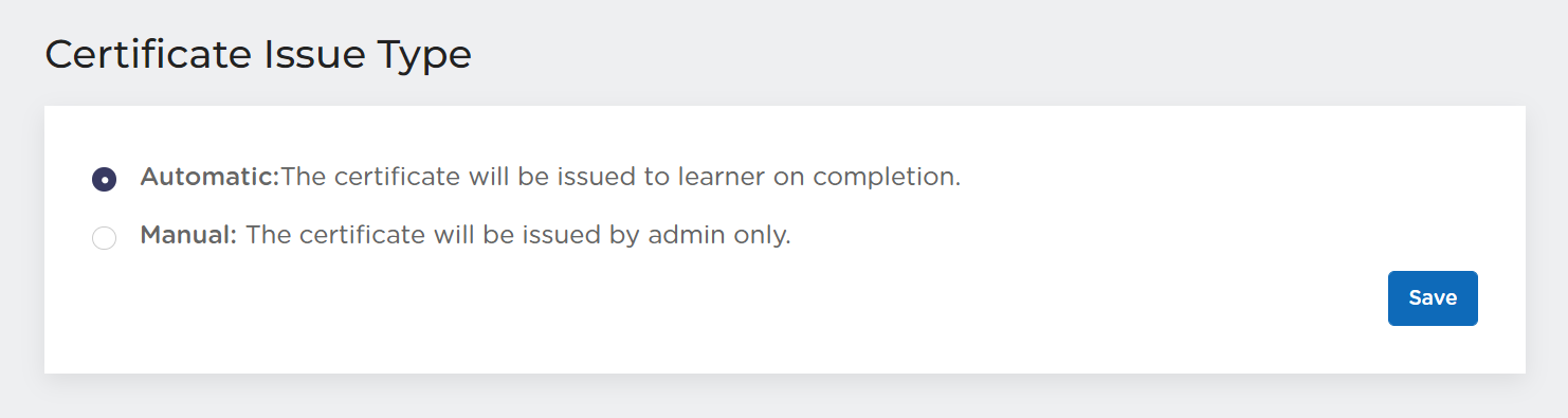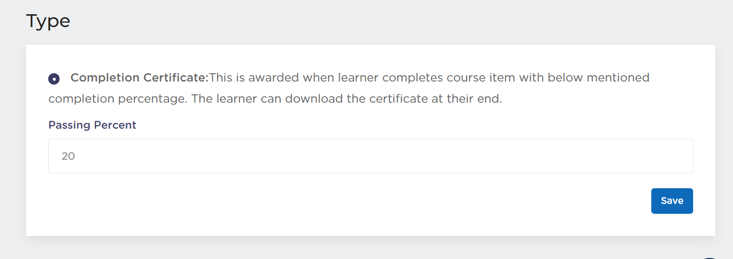 Certificate will be issued automatically to those learners who have completed all the course items in that particular course. However, you can put a restriction here through "Minimum Passing Percent". The certificate will be issued to the learner who has fulfilled the "Minimum Passing Percent".