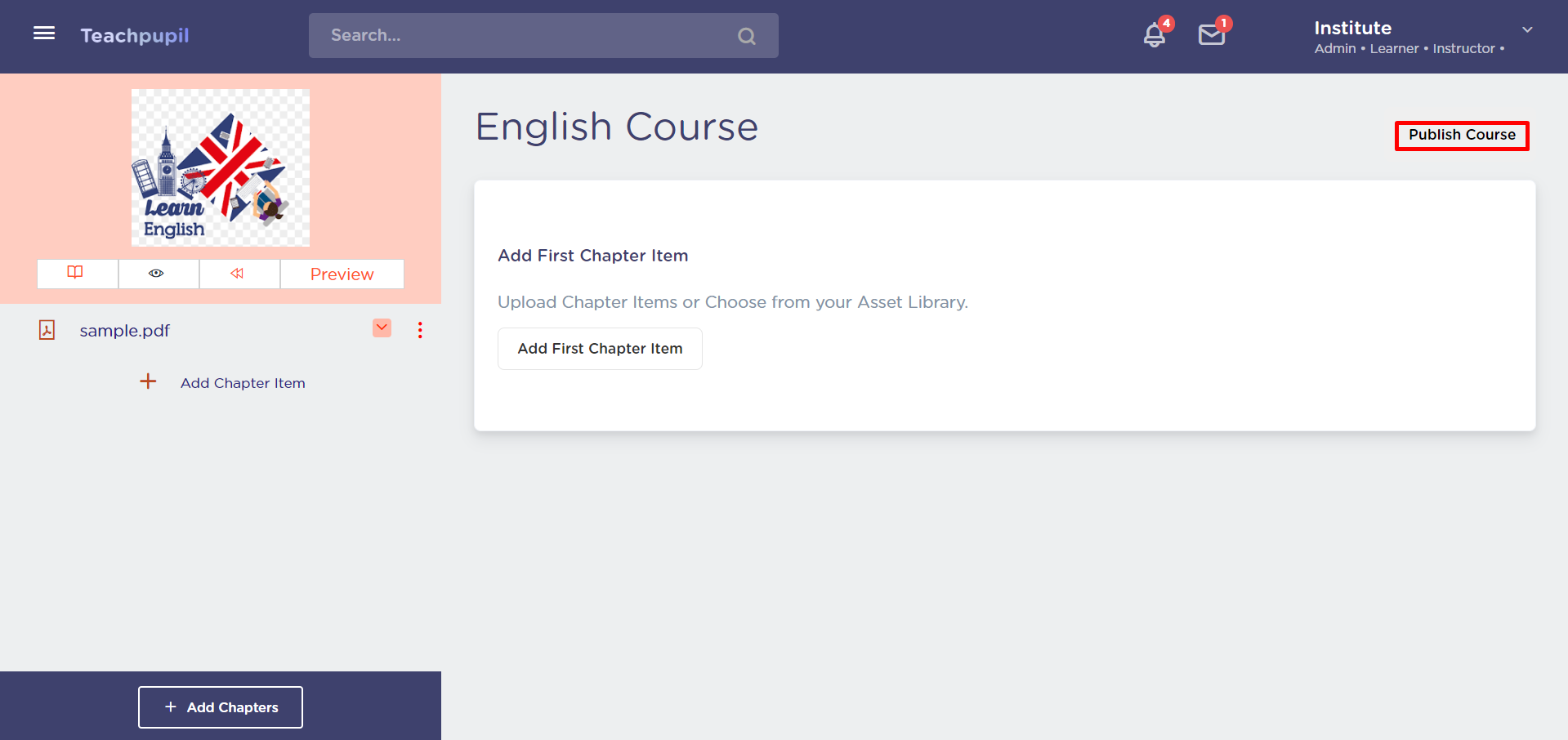 Go to the “Courses” page and click on the course builder icon. If the chapter is uploaded already then you will see the “Publish Course” link.