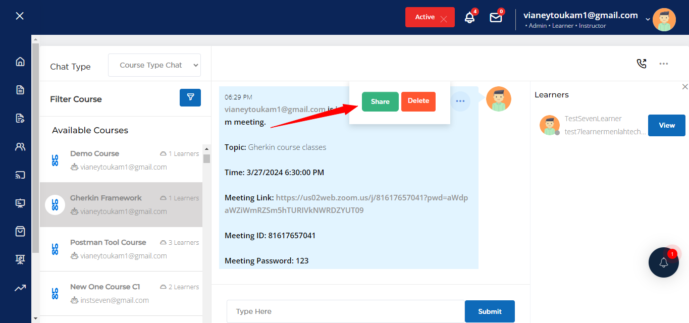 How to create live meeting? 1. Go to live meeting page. 2. Select a course and click on meeting icon of the course. 3. Now, new live class pop up will appear. After filling all the details click on submit. 4. Additional fills will appear now, after ...