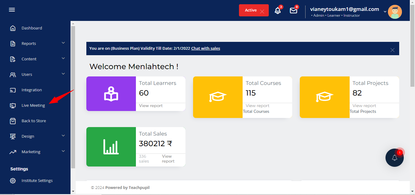 1. Log in as Admin or instructor and then navigate to Live meeting option.