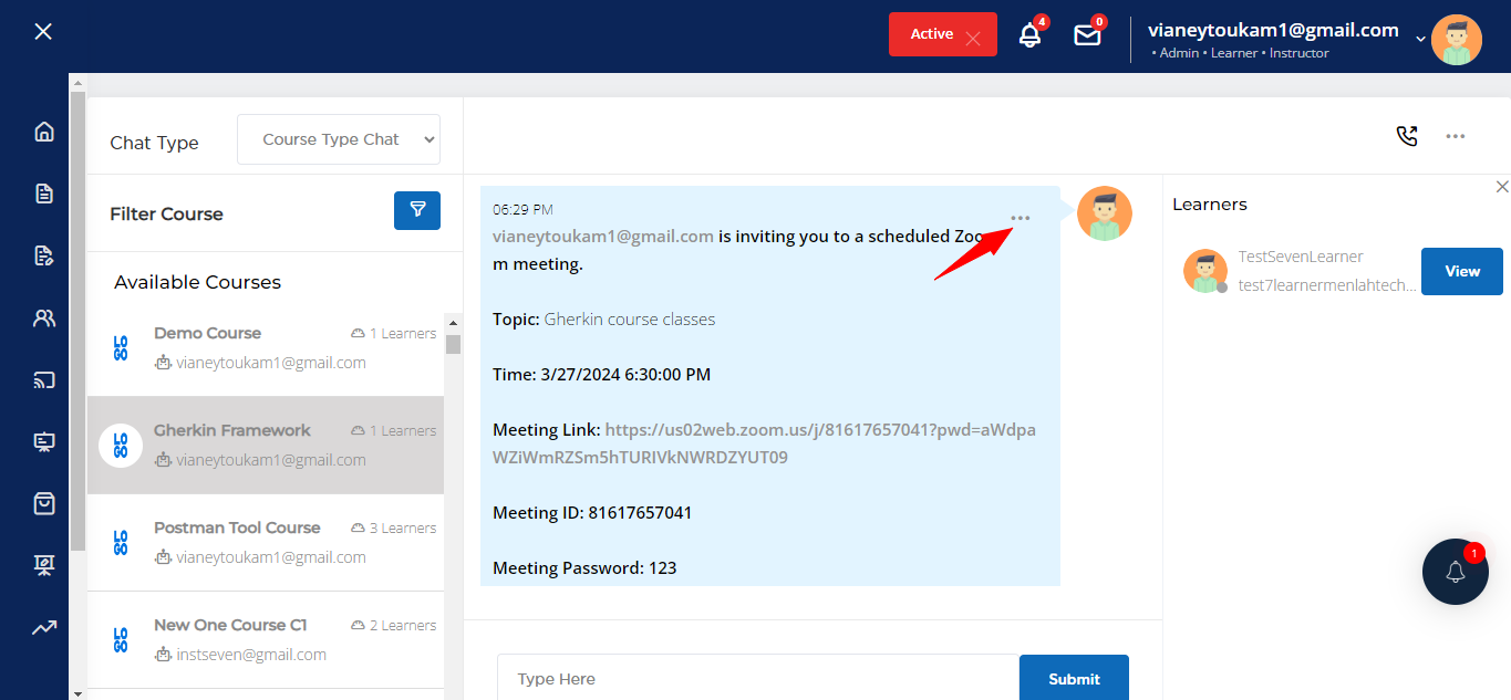 1. Go to live Meetings page. 2. Go to course chat in live meetings and click on the zoom link available in the chat of the course. 3. Another way is to click on the link from notifications. 4. It will redirect to the meeting.