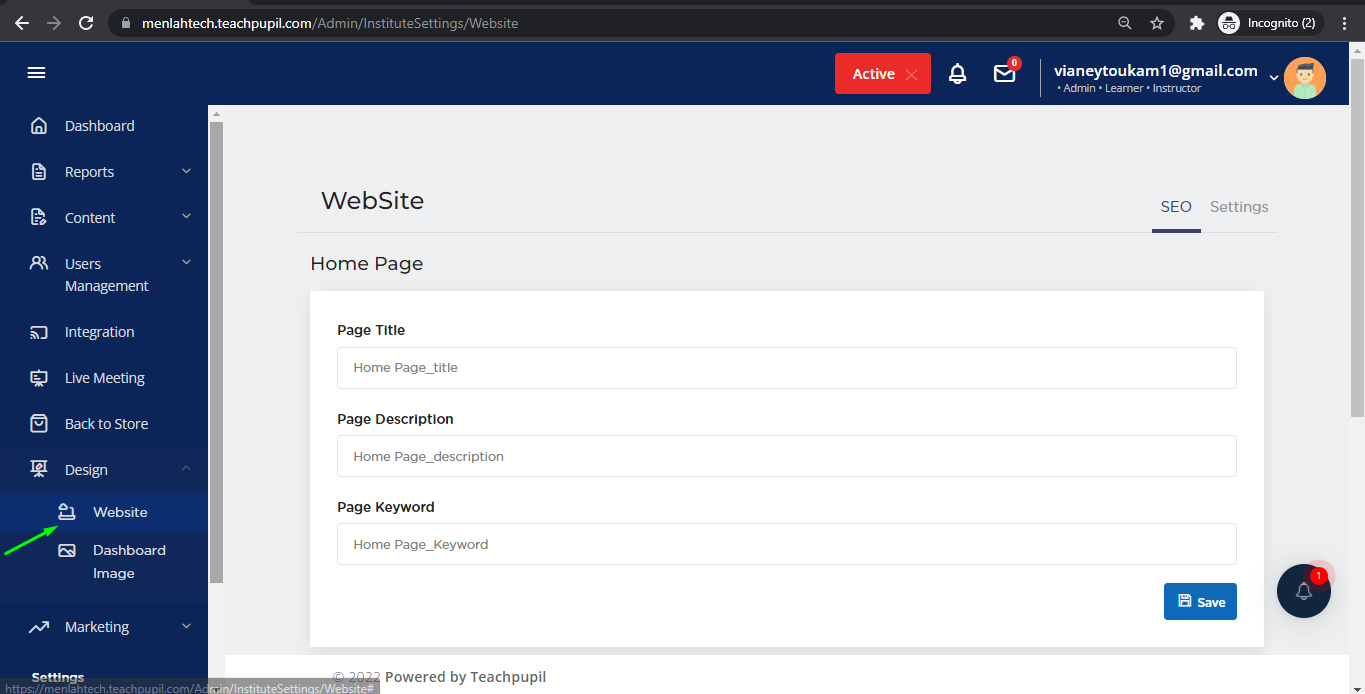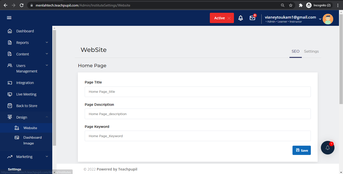 In SEO section , update the Page Title, Page Description and Page Keyword.