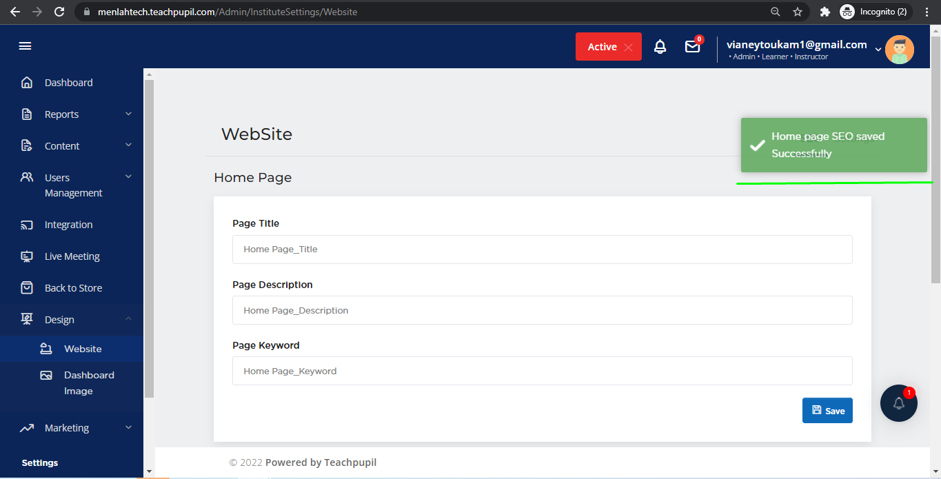Once you click on the Save button, the changes are updated and a validation message "Home page SEO saved Successfully".