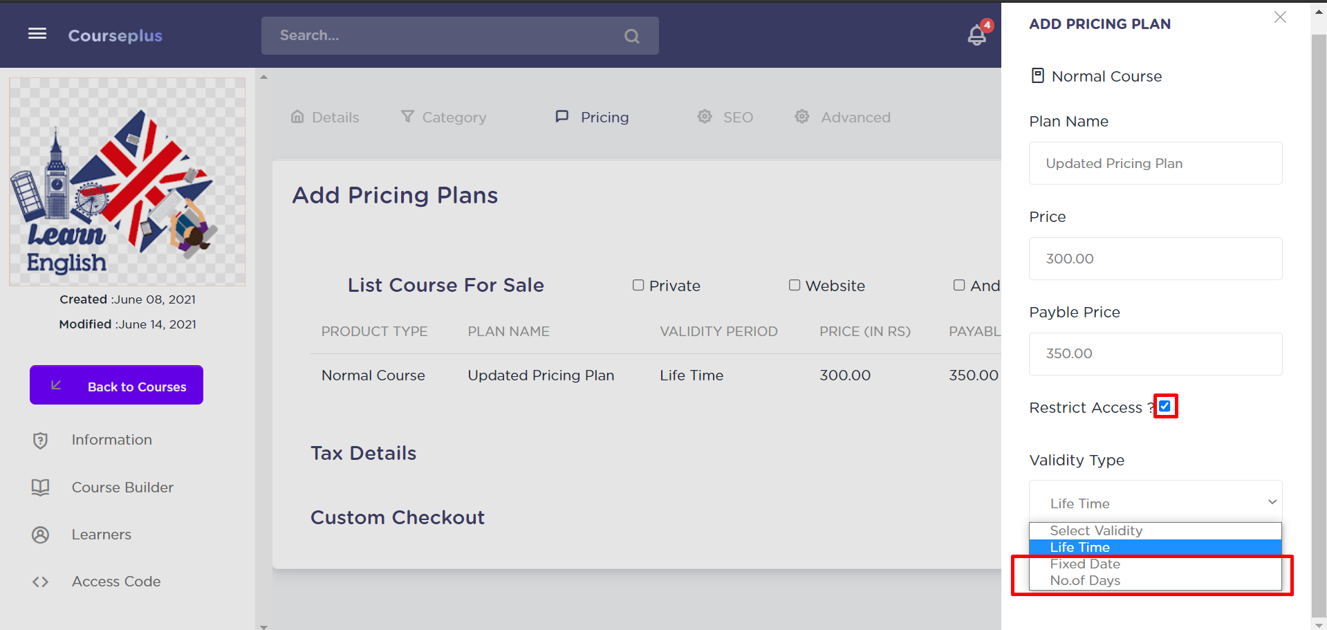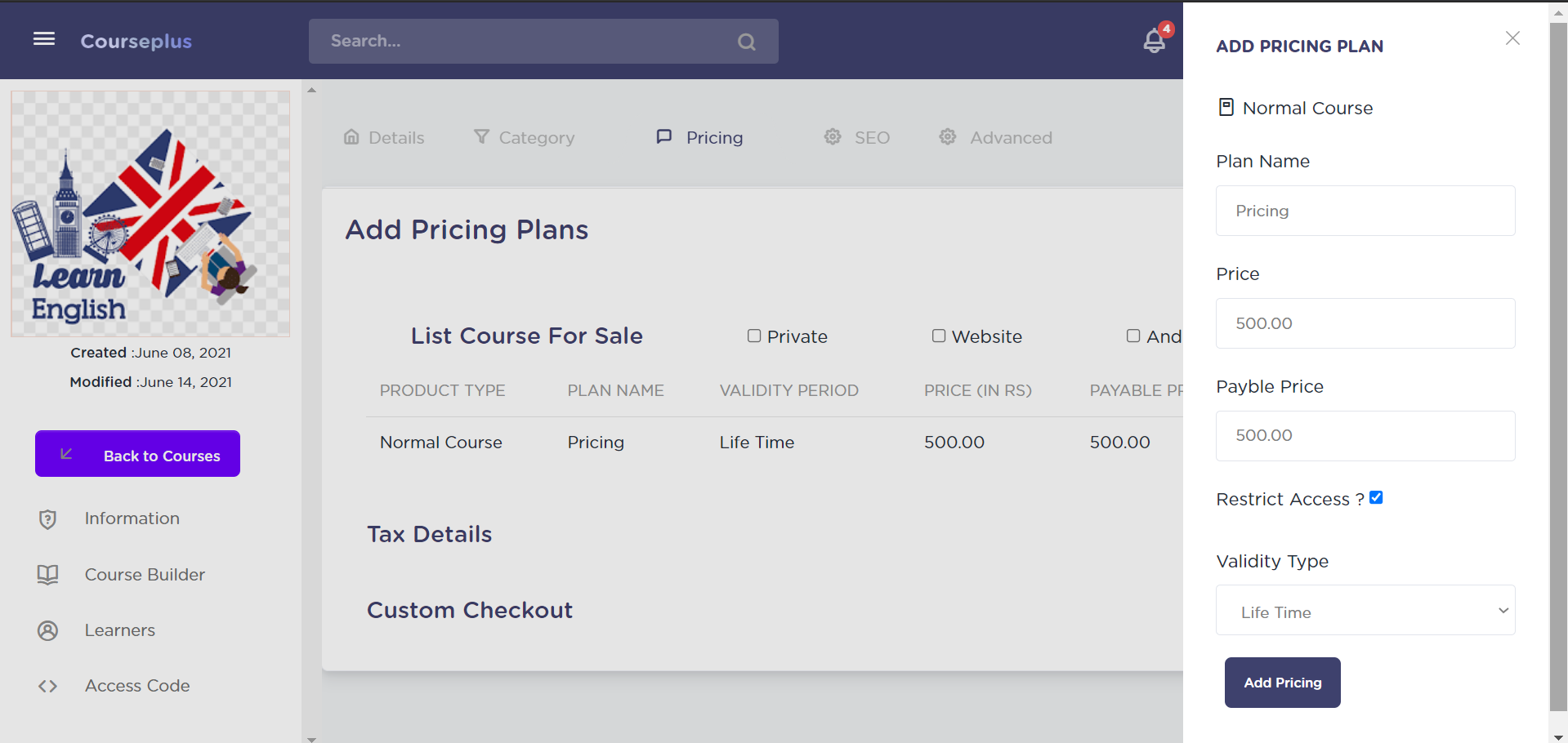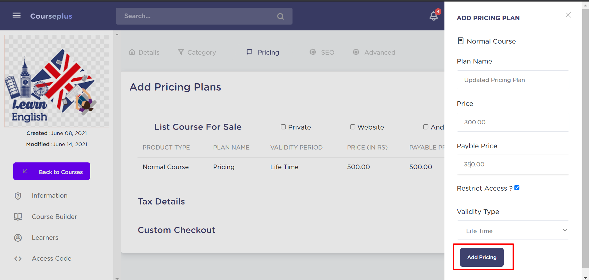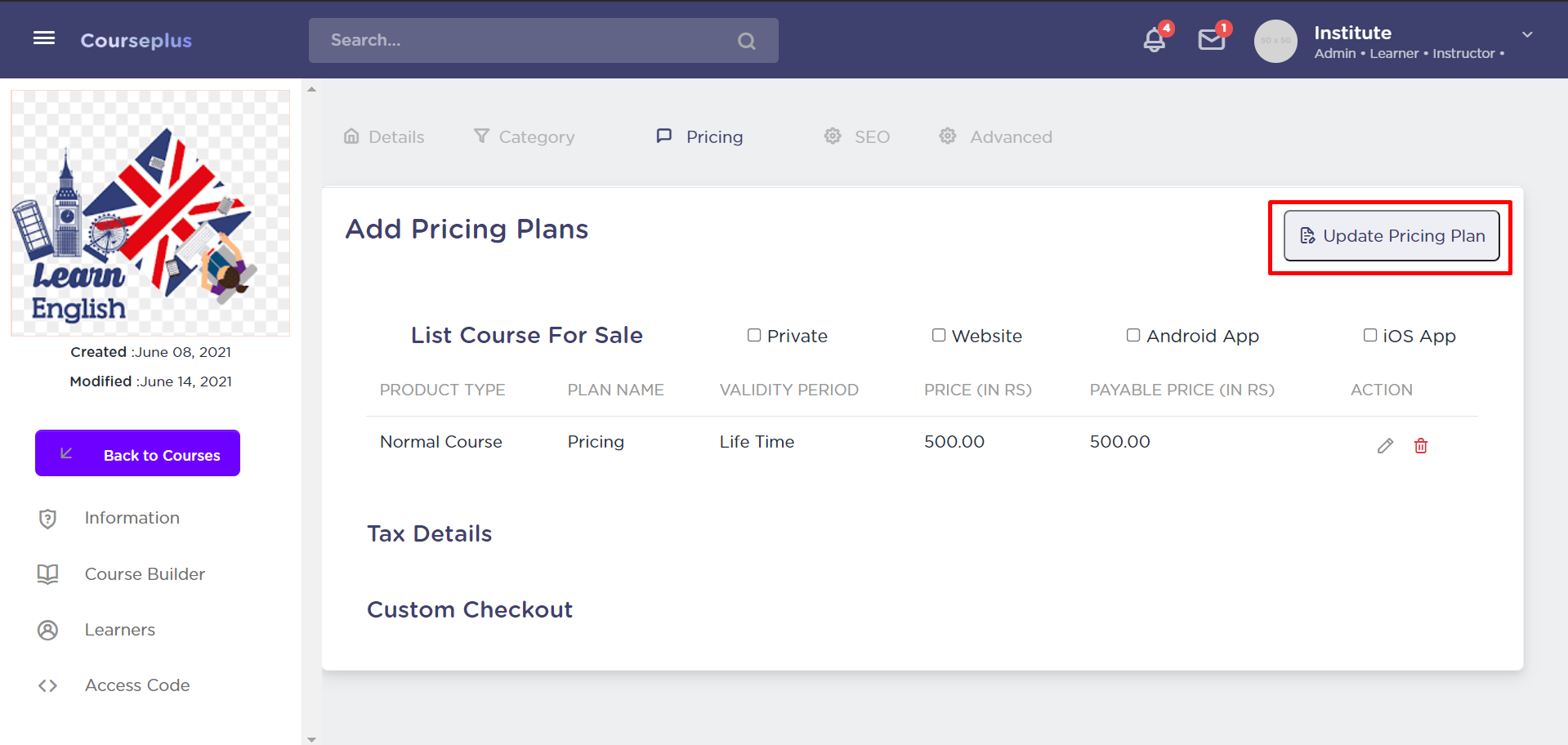 Go to the “Courses” page and click on the details icon to proceed. Click on the "Update Pricing Plan" button in the “Pricing” tab to update the pricing details.