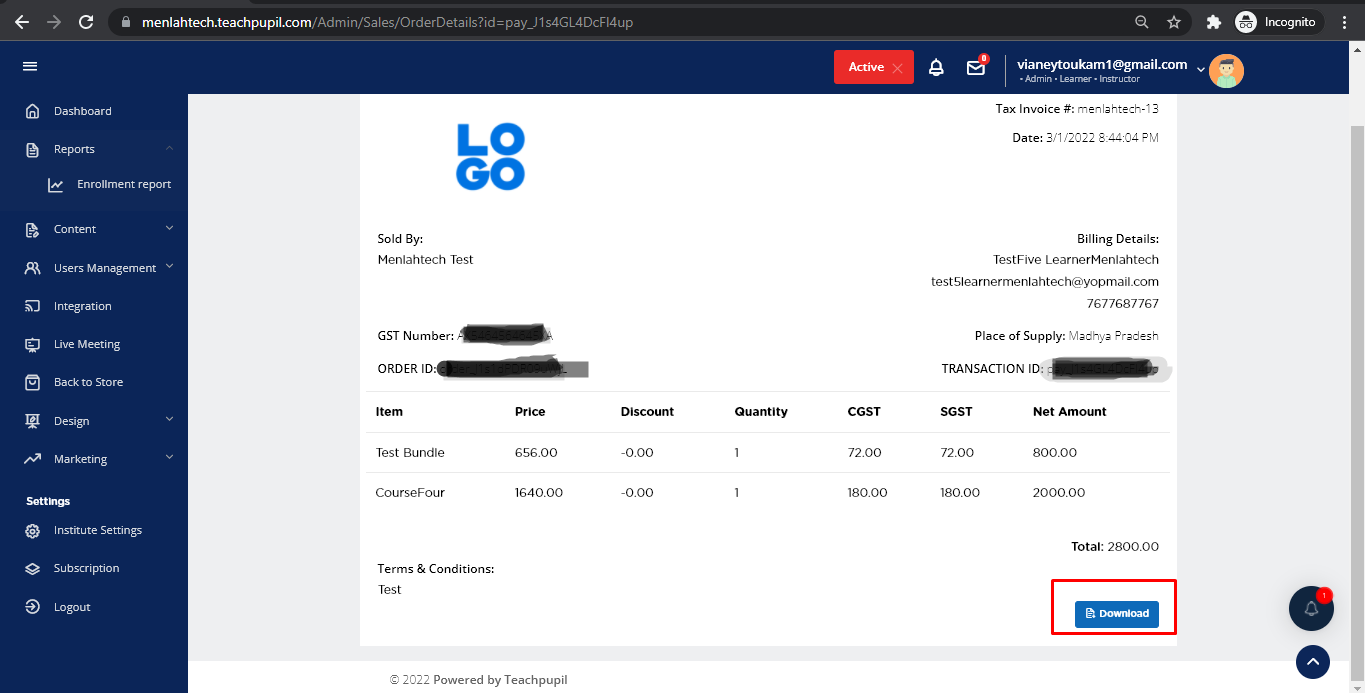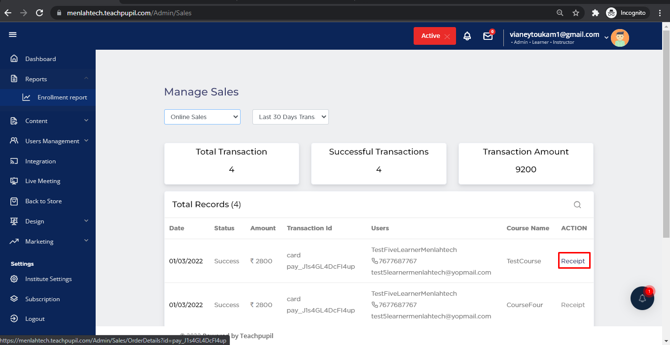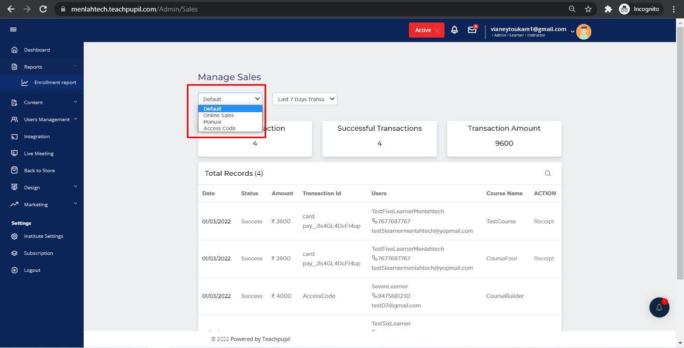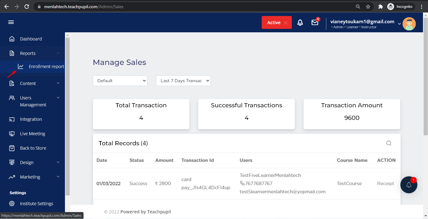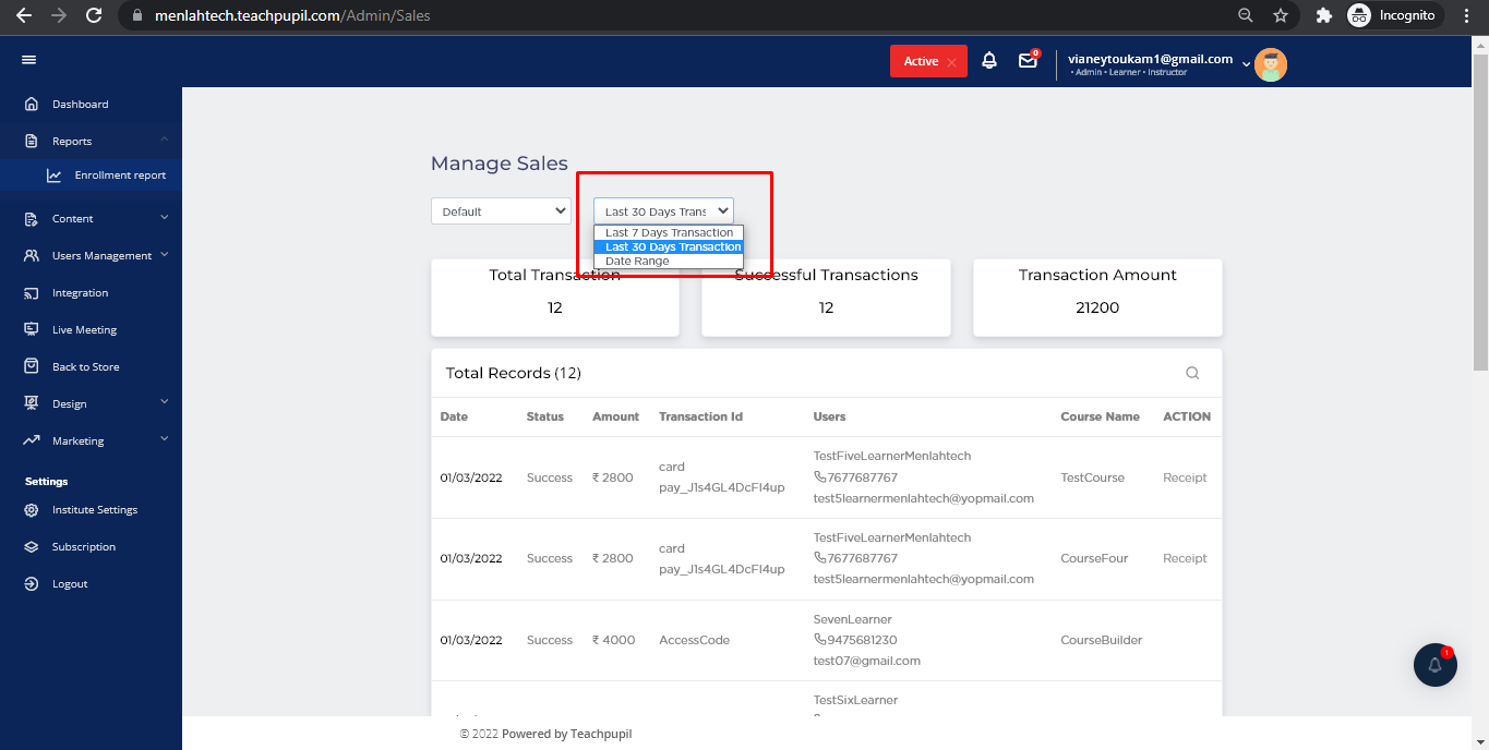 On screen you can see all the list of reports by the transactions made by the Learners