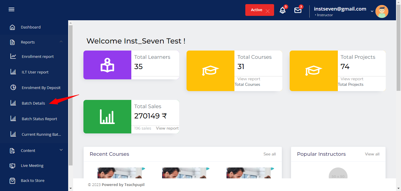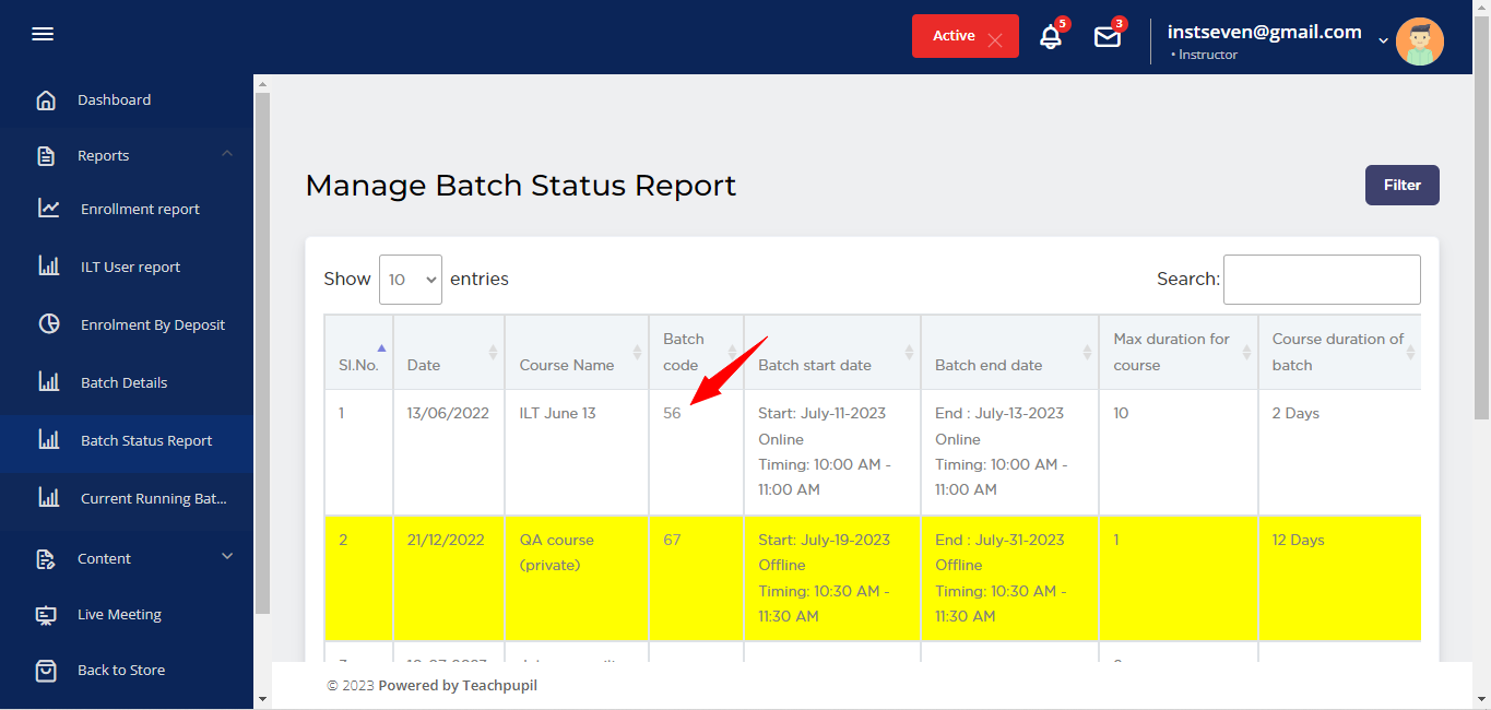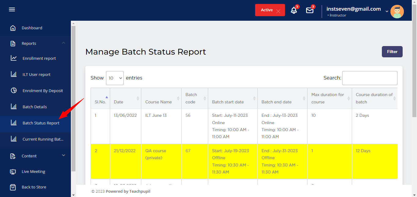 How Admins and Instructors can download csv file of batch details report page? 1. Log in as Admin or instructor. 2. Expand Reports option from left hand side menu: 3. Click on Batch details option: 4. Now, Batch Details report page will be opened. ...