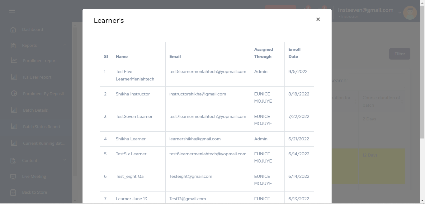 5. Click on batch code to view learners details in the particular batch.