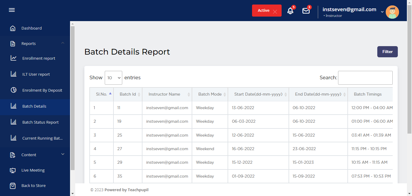 3. Batch details report will open and here you can view all the batches details of your institute.