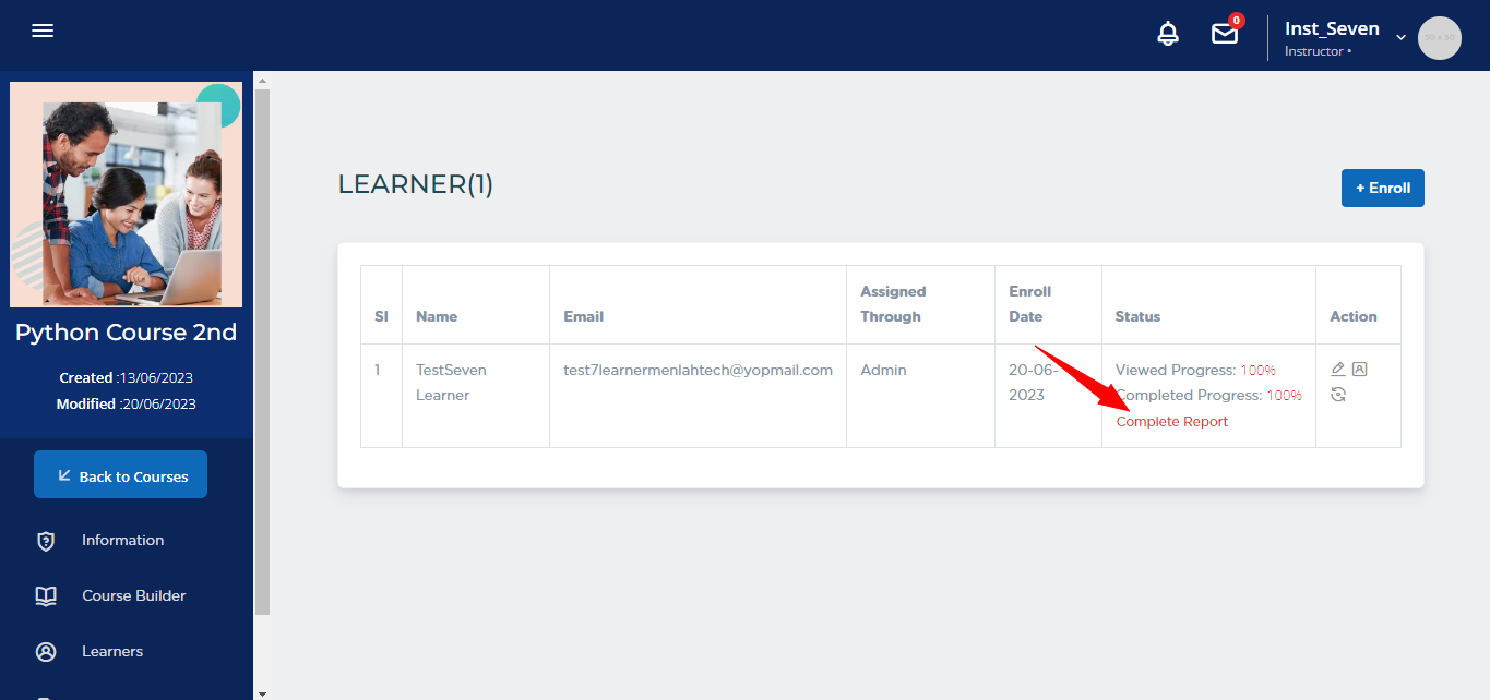 1. Log in as a learner and click on Report option from the left side menu. 3. The last report provided by Instructor will be visible on Report Details page.